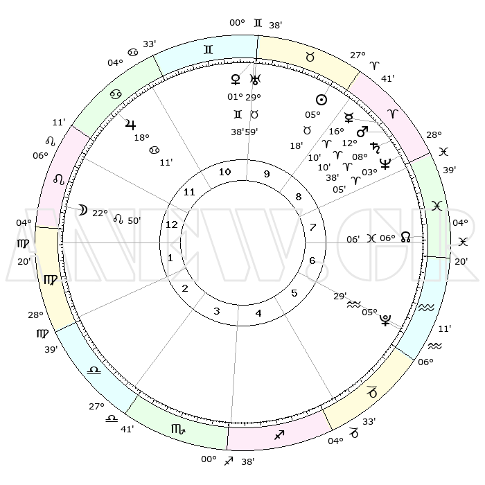 | | ΘΕΣΕΙΣ ΠΛΑΝΗΤΩΝ ΑΣΤΡΟΛΟΓΙΚΟΥ ΧΑΡΤΗ ΤΗΣ ΣΤΙΓΜΗΣ ΑΥΤΗΣ | | | | Πλανήτης | Ζώδιο | Μοίρες | Δεκαήμ. | Σε οίκο | Απόκλιση | | Ακμές των οίκων | | Ηλιος | Ταύρος | 05°14' | Πρώτο | 9 | 13 N 16 | | 1ος | 14°35' | Λέων | | Σελήνη | Λέων | 21°56' | Τρίτο | 1 | 15 N 29 | | 2ος | 06°51' | Παρθένος | | Ερμής | Κριός | 16°03' | Δεύτερο | 9 | 04 N 05 | | 3ος | 03°50' | Ζυγός | | Αφροδίτη | Δίδυμοι | 01°33' | Πρώτο | 10 | 21 N 06 | | 4ος | 06°14' | Σκορπιός | | Αρης | Κριός | 12°06' | Δεύτερο | 9 | 03 N 56 | | 5ος | 11°32' | Τοξότης | | Δίας | Καρκίνος | 18°10' | Δεύτερο | 12 | 22 N 35 | | 6ος | 15°04' | Αιγόκερως | | Κρόνος | Κριός | 08°37' | Πρώτο | 9 | 01 N 26 | | 7ος | 14°35' | Υδροχόος | | Ουρανός | Ταύρος | 29°58' | Τρίτο | 10 | 19 N 59 | | 8ος | 06°51' | Ιχθείς | | Ποσειδώνας | Κριός | 03°05' | Πρώτο | 8 | 00 N 01 | | 9ος | 03°50' | Κριός | | Πλούτωνας | Υδροχόος | 05°29' | Πρώτο | 6 | 22 S 48 | | 10ος | 06°14' | Ταύρος | | Β. Δεσμός | Ιχθείς | 06°07' | Πρώτο | 7 | 09 S 16 | | 11ος | 11°32' | Δίδυμοι | | Ωροσκόπος | Λέων | 14°35' | Δεύτερο | | | 12ος | 15°04' | Καρκίνος | | Μεσουράνημα | Ταύρος | 06°14' | Πρώτο | | | |