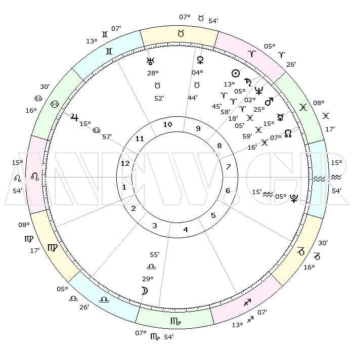 | | ΘΕΣΕΙΣ ΠΛΑΝΗΤΩΝ ΑΣΤΡΟΛΟΓΙΚΟΥ ΧΑΡΤΗ ΤΗΣ ΣΤΙΓΜΗΣ ΑΥΤΗΣ | | | | Πλανήτης | Ζώδιο | Μοίρες | Δεκαήμ. | Σε οίκο | Απόκλιση | | Ακμές των οίκων | | Ηλιος | Κριός | 13°41' | Δεύτερο | 10 | 05 N 24 | | 1ος | 24°27' | Καρκίνος | | Σελήνη | Ζυγός | 29°00' | Τρίτο | 4 | 14 S 51 | | 2ος | 15°10' | Λέων | | Ερμής | Ιχθείς | 15°54' | Δεύτερο | 9 | 07 S 05 | | 3ος | 09°29' | Παρθένος | | Αφροδίτη | Ταύρος | 04°38' | Πρώτο | 10 | 12 N 44 | | 4ος | 09°46' | Ζυγός | | Αρης | Ιχθείς | 25°01' | Τρίτο | 9 | 02 S 56 | | 5ος | 15°51' | Σκορπιός | | Δίας | Καρκίνος | 15°57' | Δεύτερο | 12 | 22 N 51 | | 6ος | 22°30' | Τοξότης | | Κρόνος | Κριός | 05°58' | Πρώτο | 9 | 00 N 25 | | 7ος | 24°27' | Αιγόκερως | | Ουρανός | Ταύρος | 28°52' | Τρίτο | 11 | 19 N 44 | | 8ος | 15°10' | Υδροχόος | | Ποσειδώνας | Κριός | 02°18' | Πρώτο | 9 | 00 S 17 | | 9ος | 09°29' | Ιχθείς | | Πλούτωνας | Υδροχόος | 05°15' | Πρώτο | 7 | 22 S 47 | | 10ος | 09°46' | Κριός | | Β. Δεσμός | Ιχθείς | 07°16' | Πρώτο | 8 | 08 S 50 | | 11ος | 15°51' | Ταύρος | | Ωροσκόπος | Καρκίνος | 24°27' | Τρίτο | | | 12ος | 22°30' | Δίδυμοι | | Μεσουράνημα | Κριός | 09°46' | Πρώτο | | | |