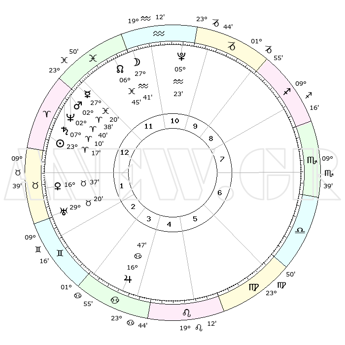 | | ΘΕΣΕΙΣ ΠΛΑΝΗΤΩΝ ΑΣΤΡΟΛΟΓΙΚΟΥ ΧΑΡΤΗ ΤΗΣ ΣΤΙΓΜΗΣ ΑΥΤΗΣ | | | | Πλανήτης | Ζώδιο | Μοίρες | Δεκαήμ. | Σε οίκο | Απόκλιση | | Ακμές των οίκων | | Ηλιος | Κριός | 23°13' | Τρίτο | 1 | 09 N 01 | | 1ος | 29°14' | Ιχθείς | | Σελήνη | Υδροχόος | 26°45' | Τρίτο | 12 | 13 S 33 | | 2ος | 09°42' | Ταύρος | | Ερμής | Ιχθείς | 27°14' | Τρίτο | 12 | 03 S 25 | | 3ος | 07°14' | Δίδυμοι | | Αφροδίτη | Ταύρος | 16°32' | Δεύτερο | 2 | 16 N 51 | | 4ος | 29°34' | Δίδυμοι | | Αρης | Κριός | 02°35' | Πρώτο | 1 | 00 N 07 | | 5ος | 21°50' | Καρκίνος | | Δίας | Καρκίνος | 16°47' | Δεύτερο | 4 | 22 N 45 | | 6ος | 19°08' | Λέων | | Κρόνος | Κριός | 07°09' | Πρώτο | 1 | 00 N 52 | | 7ος | 29°14' | Παρθένος | | Ουρανός | Ταύρος | 29°20' | Τρίτο | 2 | 19 N 50 | | 8ος | 09°42' | Σκορπιός | | Ποσειδώνας | Κριός | 02°39' | Πρώτο | 1 | 00 S 09 | | 9ος | 07°14' | Τοξότης | | Πλούτωνας | Υδροχόος | 05°23' | Πρώτο | 11 | 22 S 47 | | 10ος | 29°34' | Τοξότης | | Β. Δεσμός | Ιχθείς | 06°46' | Πρώτο | 12 | 09 S 02 | | 11ος | 21°50' | Αιγόκερως | | Ωροσκόπος | Ιχθείς | 29°14' | Τρίτο | | | 12ος | 19°08' | Υδροχόος | | Μεσουράνημα | Τοξότης | 29°34' | Τρίτο | | | |