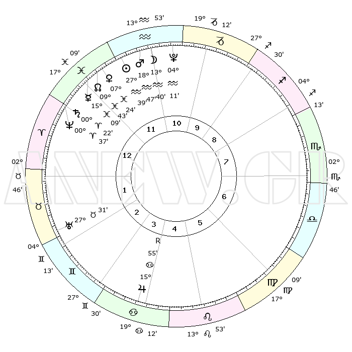 | | ΘΕΣΕΙΣ ΠΛΑΝΗΤΩΝ ΑΣΤΡΟΛΟΓΙΚΟΥ ΧΑΡΤΗ ΤΗΣ ΣΤΙΓΜΗΣ ΑΥΤΗΣ | | | | Πλανήτης | Ζώδιο | Μοίρες | Δεκαήμ. | Σε οίκο | Απόκλιση | | Ακμές των οίκων | | Ηλιος | Υδροχόος | 27°35' | Τρίτο | 12 | 12 S 18 | | 1ος | 23°26' | Ιχθείς | | Σελήνη | Υδροχόος | 12°47' | Δεύτερο | 11 | 19 S 12 | | 2ος | 05°14' | Ταύρος | | Ερμής | Ιχθείς | 15°04' | Δεύτερο | 12 | 05 S 35 | | 3ος | 03°41' | Δίδυμοι | | Αφροδίτη | Ιχθείς | 07°19' | Πρώτο | 12 | 10 S 11 | | 4ος | 26°18' | Δίδυμοι | | Αρης | Υδροχόος | 18°43' | Δεύτερο | 12 | 16 S 14 | | 5ος | 18°21' | Καρκίνος | | Δίας | Καρκίνος | 15°56'R | Δεύτερο | 4 | 22 N 49 | | 6ος | 14°47' | Λέων | | Κρόνος | Κριός | 00°22' | Πρώτο | 1 | 01 S 49 | | 7ος | 23°26' | Παρθένος | | Ουρανός | Ταύρος | 27°31' | Τρίτο | 2 | 19 N 25 | | 8ος | 05°14' | Σκορπιός | | Ποσειδώνας | Κριός | 00°37' | Πρώτο | 1 | 00 S 58 | | 9ος | 03°41' | Τοξότης | | Πλούτωνας | Υδροχόος | 04°10' | Πρώτο | 11 | 22 S 56 | | 10ος | 26°18' | Τοξότης | | Β. Δεσμός | Ιχθείς | 09°43' | Πρώτο | 12 | 07 S 55 | | 11ος | 18°21' | Αιγόκερως | | Ωροσκόπος | Ιχθείς | 23°26' | Τρίτο | | | 12ος | 14°47' | Υδροχόος | | Μεσουράνημα | Τοξότης | 26°18' | Τρίτο | | | |