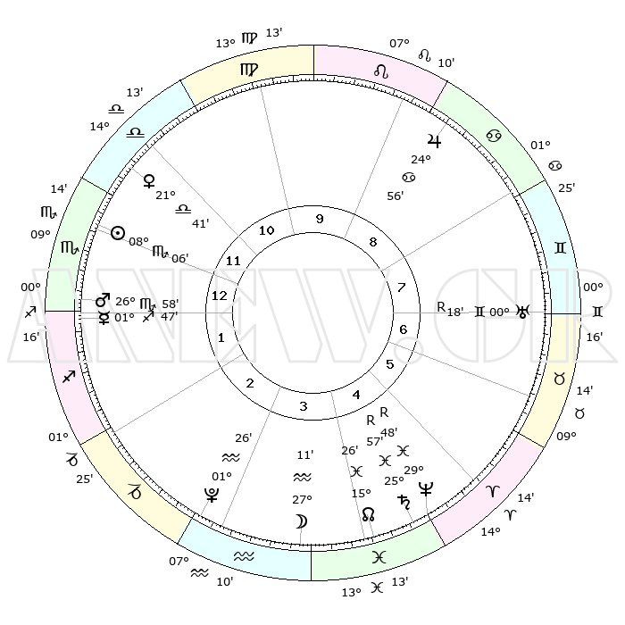 |  | ΘΕΣΕΙΣ ΠΛΑΝΗΤΩΝ ΑΣΤΡΟΛΟΓΙΚΟΥ ΧΑΡΤΗ ΤΗΣ ΣΤΙΓΜΗΣ ΑΥΤΗΣ |  |  |  | | Πλανήτης | Ζώδιο | Μοίρες | Δεκαήμ. | Σε οίκο | Απόκλιση |  | Ακμές των οίκων |  | Ηλιος | Σκορπιός | 07°52' | Πρώτο | 2 | 14 S 08 |  | 1ος | 19°38' | Παρθένος |  | Σελήνη | Υδροχόος | 23°60' | Τρίτο | 6 | 15 S 25 |  | 2ος | 15°24' | Ζυγός |  | Ερμής | Τοξότης | 01°33' | Πρώτο | 3 | 23 S 18 |  | 3ος | 15°23' | Σκορπιός |  | Αφροδίτη | Ζυγός | 21°22' | Τρίτο | 2 | 06 S 57 |  | 4ος | 18°19' | Τοξότης |  | Αρης | Σκορπιός | 26°48' | Τρίτο | 3 | 19 S 48 |  | 5ος | 21°31' | Αιγόκερως |  | Δίας | Καρκίνος | 24°56' | Τρίτο | 11 | 21 N 13 |  | 6ος | 22°21' | Υδροχόος |  | Κρόνος | Ιχθείς | 25°58'R | Τρίτο | 7 | 03 S 52 |  | 7ος | 19°38' | Ιχθείς |  | Ουρανός | Δίδυμοι | 00°19'R | Πρώτο | 9 | 20 N 00 |  | 8ος | 15°24' | Κριός |  | Ποσειδώνας | Ιχθείς | 29°48'R | Τρίτο | 7 | 01 S 20 |  | 9ος | 15°23' | Ταύρος |  | Πλούτωνας | Υδροχόος | 01°26' | Πρώτο | 5 | 23 S 31 |  | 10ος | 18°19' | Δίδυμοι |  | Β. Δεσμός | Ιχθείς | 15°27' | Δεύτερο | 6 | 05 S 44 |  | 11ος | 21°31' | Καρκίνος |  | Ωροσκόπος | Παρθένος | 19°38' | Δεύτερο |  |  | 12ος | 22°21' | Λέων |  | Μεσουράνημα | Δίδυμοι | 18°19' | Δεύτερο |  |  |  |