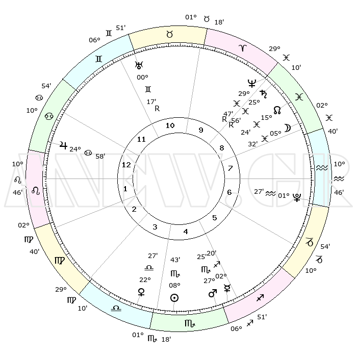 |  | ΘΕΣΕΙΣ ΠΛΑΝΗΤΩΝ ΑΣΤΡΟΛΟΓΙΚΟΥ ΧΑΡΤΗ ΤΗΣ ΣΤΙΓΜΗΣ ΑΥΤΗΣ |  |  |  | | Πλανήτης | Ζώδιο | Μοίρες | Δεκαήμ. | Σε οίκο | Απόκλιση |  | Ακμές των οίκων |  | Ηλιος | Σκορπιός | 08°26' | Πρώτο | 7 | 14 S 19 |  | 1ος | 20°43' | Κριός |  | Σελήνη | Ιχθείς | 01°34' | Πρώτο | 11 | 12 S 12 |  | 2ος | 25°31' | Ταύρος |  | Ερμής | Τοξότης | 02°04' | Πρώτο | 8 | 23 S 25 |  | 3ος | 20°06' | Δίδυμοι |  | Αφροδίτη | Ζυγός | 22°05' | Τρίτο | 7 | 07 S 14 |  | 4ος | 11°50' | Καρκίνος |  | Αρης | Σκορπιός | 27°12' | Τρίτο | 8 | 19 S 54 |  | 5ος | 05°24' | Λέων |  | Δίας | Καρκίνος | 24°57' | Τρίτο | 4 | 21 N 13 |  | 6ος | 06°20' | Παρθένος |  | Κρόνος | Ιχθείς | 25°57'R | Τρίτο | 12 | 03 S 53 |  | 7ος | 20°43' | Ζυγός |  | Ουρανός | Δίδυμοι | 00°17'R | Πρώτο | 2 | 20 N 00 |  | 8ος | 25°31' | Σκορπιός |  | Ποσειδώνας | Ιχθείς | 29°48'R | Τρίτο | 12 | 01 S 20 |  | 9ος | 20°06' | Τοξότης |  | Πλούτωνας | Υδροχόος | 01°26' | Πρώτο | 10 | 23 S 31 |  | 10ος | 11°50' | Αιγόκερως |  | Β. Δεσμός | Ιχθείς | 15°25' | Δεύτερο | 12 | 05 S 45 |  | 11ος | 05°24' | Υδροχόος |  | Ωροσκόπος | Κριός | 20°43' | Τρίτο |  |  | 12ος | 06°20' | Ιχθείς |  | Μεσουράνημα | Αιγόκερως | 11°50' | Δεύτερο |  |  |  |