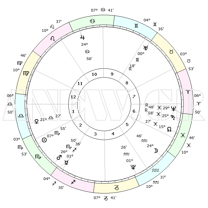 | | ΘΕΣΕΙΣ ΠΛΑΝΗΤΩΝ ΑΣΤΡΟΛΟΓΙΚΟΥ ΧΑΡΤΗ ΤΗΣ ΣΤΙΓΜΗΣ ΑΥΤΗΣ | | | | Πλανήτης | Ζώδιο | Μοίρες | Δεκαήμ. | Σε οίκο | Απόκλιση | | Ακμές των οίκων | | Ηλιος | Σκορπιός | 07°44' | Πρώτο | 4 | 14 S 05 | | 1ος | 12°11' | Λέων | | Σελήνη | Υδροχόος | 22°19' | Τρίτο | 7 | 16 S 06 | | 2ος | 04°13' | Παρθένος | | Ερμής | Τοξότης | 01°26' | Πρώτο | 4 | 23 S 16 | | 3ος | 00°54' | Ζυγός | | Αφροδίτη | Ζυγός | 21°13' | Τρίτο | 3 | 06 S 54 | | 4ος | 03°08' | Σκορπιός | | Αρης | Σκορπιός | 26°42' | Τρίτο | 4 | 19 S 47 | | 5ος | 08°36' | Τοξότης | | Δίας | Καρκίνος | 24°55' | Τρίτο | 12 | 21 N 13 | | 6ος | 12°28' | Αιγόκερως | | Κρόνος | Ιχθείς | 25°58'R | Τρίτο | 8 | 03 S 52 | | 7ος | 12°11' | Υδροχόος | | Ουρανός | Δίδυμοι | 00°19'R | Πρώτο | 10 | 20 N 00 | | 8ος | 04°13' | Ιχθείς | | Ποσειδώνας | Ιχθείς | 29°49'R | Τρίτο | 8 | 01 S 20 | | 9ος | 00°54' | Κριός | | Πλούτωνας | Υδροχόος | 01°26' | Πρώτο | 6 | 23 S 31 | | 10ος | 03°08' | Ταύρος | | Β. Δεσμός | Ιχθείς | 15°27' | Δεύτερο | 8 | 05 S 44 | | 11ος | 08°36' | Δίδυμοι | | Ωροσκόπος | Λέων | 12°11' | Δεύτερο | | | 12ος | 12°28' | Καρκίνος | | Μεσουράνημα | Ταύρος | 03°08' | Πρώτο | | | |