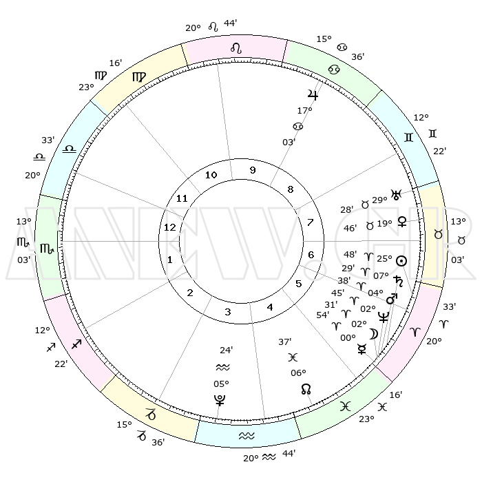 | | ΘΕΣΕΙΣ ΠΛΑΝΗΤΩΝ ΑΣΤΡΟΛΟΓΙΚΟΥ ΧΑΡΤΗ ΤΗΣ ΣΤΙΓΜΗΣ ΑΥΤΗΣ | | | | Πλανήτης | Ζώδιο | Μοίρες | Δεκαήμ. | Σε οίκο | Απόκλιση | | Ακμές των οίκων | | Ηλιος | Κριός | 25°44' | Τρίτο | 7 | 09 N 57 | | 1ος | 23°28' | Ζυγός | | Σελήνη | Κριός | 01°34' | Πρώτο | 6 | 02 N 30 | | 2ος | 21°30' | Σκορπιός | | Ερμής | Κριός | 00°48' | Πρώτο | 6 | 02 S 05 | | 3ος | 23°00' | Τοξότης | | Αφροδίτη | Ταύρος | 19°41' | Δεύτερο | 7 | 17 N 51 | | 4ος | 26°47' | Αιγόκερως | | Αρης | Κριός | 04°35' | Πρώτο | 6 | 00 N 55 | | 5ος | 29°44' | Υδροχόος | | Δίας | Καρκίνος | 17°02' | Δεύτερο | 9 | 22 N 44 | | 6ος | 28°57' | Ιχθείς | | Κρόνος | Κριός | 07°28' | Πρώτο | 6 | 01 N 00 | | 7ος | 23°28' | Κριός | | Ουρανός | Ταύρος | 29°28' | Τρίτο | 8 | 19 N 52 | | 8ος | 21°30' | Ταύρος | | Ποσειδώνας | Κριός | 02°45' | Πρώτο | 6 | 00 S 07 | | 9ος | 23°00' | Δίδυμοι | | Πλούτωνας | Υδροχόος | 05°24' | Πρώτο | 4 | 22 S 47 | | 10ος | 26°47' | Καρκίνος | | Β. Δεσμός | Ιχθείς | 06°38' | Πρώτο | 5 | 09 S 05 | | 11ος | 29°44' | Λέων | | Ωροσκόπος | Ζυγός | 23°28' | Τρίτο | | | 12ος | 28°57' | Παρθένος | | Μεσουράνημα | Καρκίνος | 26°47' | Τρίτο | | | |