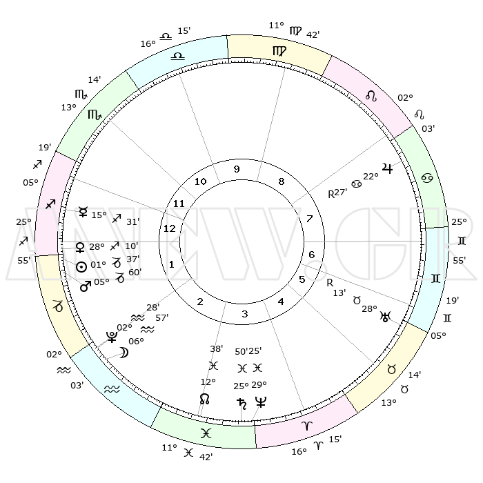 | | ΘΕΣΕΙΣ ΠΛΑΝΗΤΩΝ ΑΣΤΡΟΛΟΓΙΚΟΥ ΧΑΡΤΗ ΤΗΣ ΣΤΙΓΜΗΣ ΑΥΤΗΣ | | | | Πλανήτης | Ζώδιο | Μοίρες | Δεκαήμ. | Σε οίκο | Απόκλιση | | Ακμές των οίκων | | Ηλιος | Αιγόκερως | 01°32' | Πρώτο | 2 | 23 S 25 | | 1ος | 00°20' | Τοξότης | | Σελήνη | Υδροχόος | 05°54' | Πρώτο | 2 | 21 S 38 | | 2ος | 01°31' | Αιγόκερως | | Ερμής | Τοξότης | 15°24' | Δεύτερο | 1 | 22 S 09 | | 3ος | 07°16' | Υδροχόος | | Αφροδίτη | Τοξότης | 28°04' | Τρίτο | 1 | 23 S 35 | | 4ος | 13°20' | Ιχθείς | | Αρης | Αιγόκερως | 05°56' | Πρώτο | 2 | 24 S 08 | | 5ος | 14°19' | Κριός | | Δίας | Καρκίνος | 22°28'R | Τρίτο | 8 | 21 N 46 | | 6ος | 09°19' | Ταύρος | | Κρόνος | Ιχθείς | 25°50' | Τρίτο | 4 | 03 S 45 | | 7ος | 00°20' | Δίδυμοι | | Ουρανός | Ταύρος | 28°13'R | Τρίτο | 6 | 19 N 34 | | 8ος | 01°31' | Καρκίνος | | Ποσειδώνας | Ιχθείς | 29°25' | Τρίτο | 4 | 01 S 28 | | 9ος | 07°16' | Λέων | | Πλούτωνας | Υδροχόος | 02°28' | Πρώτο | 2 | 23 S 16 | | 10ος | 13°20' | Παρθένος | | Β. Δεσμός | Ιχθείς | 12°38' | Δεύτερο | 3 | 06 S 49 | | 11ος | 14°19' | Ζυγός | | Ωροσκόπος | Τοξότης | 00°20' | Πρώτο | | | 12ος | 09°19' | Σκορπιός | | Μεσουράνημα | Παρθένος | 13°20' | Δεύτερο | | | |