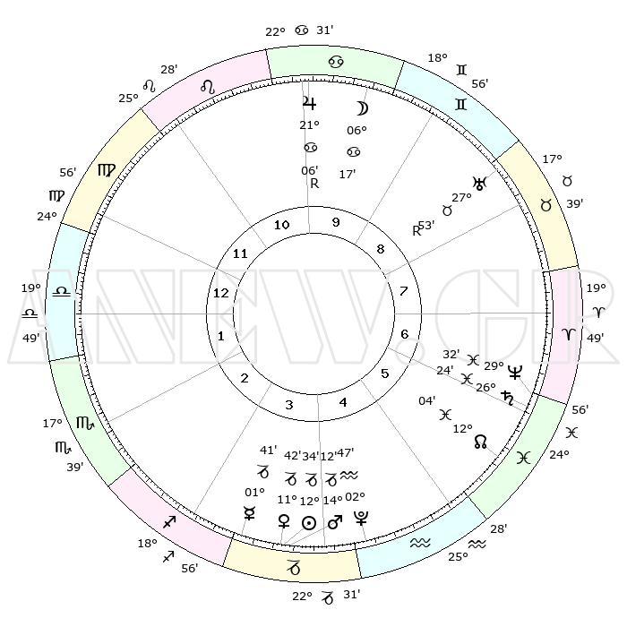 | | ΘΕΣΕΙΣ ΠΛΑΝΗΤΩΝ ΑΣΤΡΟΛΟΓΙΚΟΥ ΧΑΡΤΗ ΤΗΣ ΣΤΙΓΜΗΣ ΑΥΤΗΣ | | | | Πλανήτης | Ζώδιο | Μοίρες | Δεκαήμ. | Σε οίκο | Απόκλιση | | Ακμές των οίκων | | Ηλιος | Αιγόκερως | 12°29' | Δεύτερο | 4 | 22 S 51 | | 1ος | 24°28' | Παρθένος | | Σελήνη | Καρκίνος | 04°60' | Πρώτο | 10 | 27 N 57 | | 2ος | 20°38' | Ζυγός | | Ερμής | Αιγόκερως | 01°33' | Πρώτο | 4 | 24 S 12 | | 3ος | 20°51' | Σκορπιός | | Αφροδίτη | Αιγόκερως | 11°35' | Δεύτερο | 4 | 23 S 30 | | 4ος | 23°47' | Τοξότης | | Αρης | Αιγόκερως | 14°08' | Δεύτερο | 4 | 23 S 35 | | 5ος | 26°51' | Αιγόκερως | | Δίας | Καρκίνος | 21°06'R | Τρίτο | 10 | 22 N 01 | | 6ος | 27°30' | Υδροχόος | | Κρόνος | Ιχθείς | 26°24' | Τρίτο | 7 | 03 S 30 | | 7ος | 24°28' | Ιχθείς | | Ουρανός | Ταύρος | 27°54'R | Τρίτο | 9 | 19 N 30 | | 8ος | 20°38' | Κριός | | Ποσειδώνας | Ιχθείς | 29°32' | Τρίτο | 7 | 01 S 24 | | 9ος | 20°51' | Ταύρος | | Πλούτωνας | Υδροχόος | 02°47' | Πρώτο | 5 | 23 S 12 | | 10ος | 23°47' | Δίδυμοι | | Β. Δεσμός | Ιχθείς | 12°04' | Δεύτερο | 6 | 07 S 02 | | 11ος | 26°51' | Καρκίνος | | Ωροσκόπος | Παρθένος | 24°28' | Τρίτο | | | 12ος | 27°30' | Λέων | | Μεσουράνημα | Δίδυμοι | 23°47' | Τρίτο | | | |