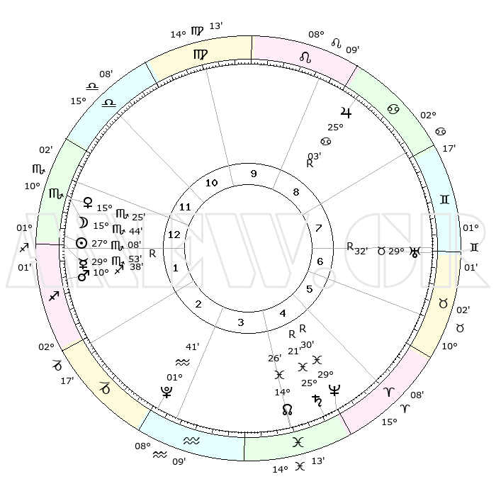 | | ΘΕΣΕΙΣ ΠΛΑΝΗΤΩΝ ΑΣΤΡΟΛΟΓΙΚΟΥ ΧΑΡΤΗ ΤΗΣ ΣΤΙΓΜΗΣ ΑΥΤΗΣ | | | | Πλανήτης | Ζώδιο | Μοίρες | Δεκαήμ. | Σε οίκο | Απόκλιση | | Ακμές των οίκων | | Ηλιος | Σκορπιός | 27°04' | Τρίτο | 1 | 19 S 30 | | 1ος | 12°52' | Σκορπιός | | Σελήνη | Σκορπιός | 14°59' | Δεύτερο | 1 | 20 S 27 | | 2ος | 12°10' | Τοξότης | | Ερμής | Σκορπιός | 29°58'R | Τρίτο | 1 | 20 S 01 | | 3ος | 15°23' | Αιγόκερως | | Αφροδίτη | Σκορπιός | 15°21' | Δεύτερο | 1 | 15 S 23 | | 4ος | 20°30' | Υδροχόος | | Αρης | Τοξότης | 10°36' | Δεύτερο | 1 | 22 S 35 | | 5ος | 23°03' | Ιχθείς | | Δίας | Καρκίνος | 25°03'R | Τρίτο | 9 | 21 N 15 | | 6ος | 20°21' | Κριός | | Κρόνος | Ιχθείς | 25°21'R | Τρίτο | 5 | 04 S 04 | | 7ος | 12°52' | Ταύρος | | Ουρανός | Ταύρος | 29°32'R | Τρίτο | 7 | 19 N 51 | | 8ος | 12°10' | Δίδυμοι | | Ποσειδώνας | Ιχθείς | 29°30'R | Τρίτο | 5 | 01 S 27 | | 9ος | 15°23' | Καρκίνος | | Πλούτωνας | Υδροχόος | 01°41' | Πρώτο | 3 | 23 S 27 | | 10ος | 20°30' | Λέων | | Β. Δεσμός | Ιχθείς | 14°26' | Δεύτερο | 4 | 06 S 08 | | 11ος | 23°03' | Παρθένος | | Ωροσκόπος | Σκορπιός | 12°52' | Δεύτερο | | | 12ος | 20°21' | Ζυγός | | Μεσουράνημα | Λέων | 20°30' | Τρίτο | | | |