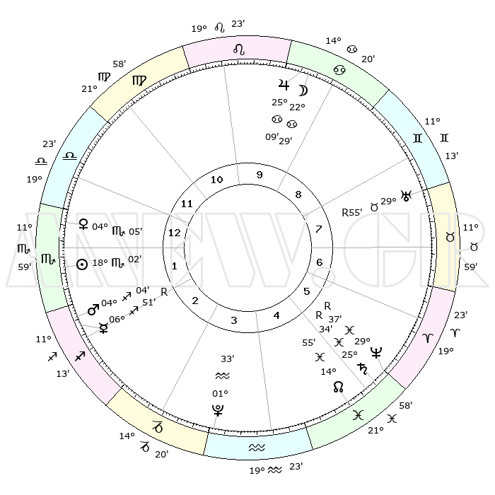 | | ΘΕΣΕΙΣ ΠΛΑΝΗΤΩΝ ΑΣΤΡΟΛΟΓΙΚΟΥ ΧΑΡΤΗ ΤΗΣ ΣΤΙΓΜΗΣ ΑΥΤΗΣ | | | | Πλανήτης | Ζώδιο | Μοίρες | Δεκαήμ. | Σε οίκο | Απόκλιση | | Ακμές των οίκων | | Ηλιος | Σκορπιός | 17°54' | Δεύτερο | 2 | 17 S 10 | | 1ος | 00°33' | Ζυγός | | Σελήνη | Καρκίνος | 20°29' | Τρίτο | 10 | 26 N 01 | | 2ος | 27°10' | Ζυγός | | Ερμής | Τοξότης | 06°51'R | Πρώτο | 3 | 23 S 44 | | 3ος | 27°38' | Σκορπιός | | Αφροδίτη | Σκορπιός | 03°54' | Πρώτο | 2 | 11 S 34 | | 4ος | 00°37' | Αιγόκερως | | Αρης | Τοξότης | 03°58' | Πρώτο | 3 | 21 S 24 | | 5ος | 03°35' | Υδροχόος | | Δίας | Καρκίνος | 25°09' | Τρίτο | 10 | 21 N 12 | | 6ος | 03°60' | Ιχθείς | | Κρόνος | Ιχθείς | 25°34'R | Τρίτο | 6 | 04 S 00 | | 7ος | 00°33' | Κριός | | Ουρανός | Ταύρος | 29°55'R | Τρίτο | 9 | 19 N 55 | | 8ος | 27°10' | Κριός | | Ποσειδώνας | Ιχθείς | 29°38'R | Τρίτο | 6 | 01 S 24 | | 9ος | 27°38' | Ταύρος | | Πλούτωνας | Υδροχόος | 01°32' | Πρώτο | 4 | 23 S 29 | | 10ος | 00°37' | Καρκίνος | | Β. Δεσμός | Ιχθείς | 14°55' | Δεύτερο | 6 | 05 S 56 | | 11ος | 03°35' | Λέων | | Ωροσκόπος | Ζυγός | 00°33' | Πρώτο | | | 12ος | 03°60' | Παρθένος | | Μεσουράνημα | Καρκίνος | 00°37' | Πρώτο | | | |