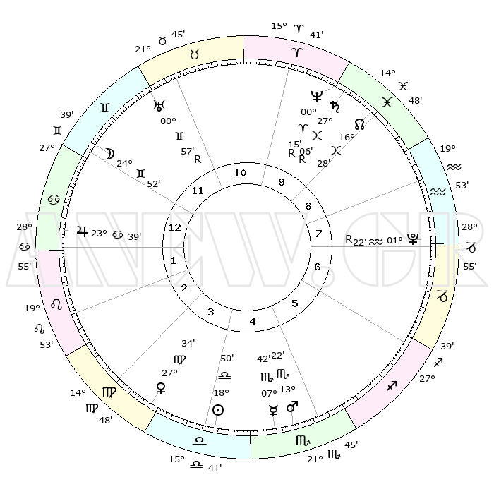 | ΘΕΣΕΙΣ ΠΛΑΝΗΤΩΝ ΑΣΤΡΟΛΟΓΙΚΟΥ ΧΑΡΤΗ ΤΗΣ ΣΤΙΓΜΗΣ ΑΥΤΗΣ | | Πλανήτης | Ζώδιο | Μοίρες | Δεκαήμ. | Σε οίκο | Απόκλιση | | Ακμές των οίκων | Ηλιος | Ζυγός | 18°42' | Δεύτερο | 5 | 07 S 19 | | 1ος | 11°21' | Δίδυμοι | Σελήνη | Δίδυμοι | 22°45' | Τρίτο | 1 | 28 N 25 | | 2ος | 04°08' | Καρκίνος | Ερμής | Σκορπιός | 07°30' | Πρώτο | 6 | 15 S 18 | | 3ος | 25°21' | Καρκίνος | Αφροδίτη | Παρθένος | 27°23' | Τρίτο | 5 | 02 N 24 | | 4ος | 19°08' | Λέων | Αρης | Σκορπιός | 13°16' | Δεύτερο | 6 | 16 S 00 | | 5ος | 19°40' | Παρθένος | Δίας | Καρκίνος | 23°38' | Τρίτο | 2 | 21 N 24 | | 6ος | 29°31' | Ζυγός | Κρόνος | Ιχθείς | 27°06'R | Τρίτο | 11 | 03 S 27 | | 7ος | 11°21' | Τοξότης | Ουρανός | Δίδυμοι | 00°57'R | Πρώτο | 12 | 20 N 08 | | 8ος | 04°08' | Αιγόκερως | Ποσειδώνας | Κριός | 00°16'R | Πρώτο | 11 | 01 S 09 | | 9ος | 25°21' | Αιγόκερως | Πλούτωνας | Υδροχόος | 01°22'R | Πρώτο | 9 | 23 S 32 | | 10ος | 19°08' | Υδροχόος | Β. Δεσμός | Ιχθείς | 16°28' | Δεύτερο | 10 | 05 S 20 | | 11ος | 19°40' | Ιχθείς | Ωροσκόπος | Δίδυμοι | 11°21' | Δεύτερο | | | 12ος | 29°31' | Κριός | Μεσουράνημα | Υδροχόος | 19°08' | Δεύτερο | | | |