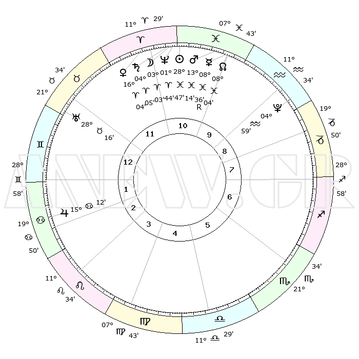 | | ΘΕΣΕΙΣ ΠΛΑΝΗΤΩΝ ΑΣΤΡΟΛΟΓΙΚΟΥ ΧΑΡΤΗ ΤΗΣ ΣΤΙΓΜΗΣ ΑΥΤΗΣ | | | | Πλανήτης | Ζώδιο | Μοίρες | Δεκαήμ. | Σε οίκο | Απόκλιση | | Ακμές των οίκων | | Ηλιος | Ιχθείς | 28°43' | Τρίτο | 11 | 00 S 31 | | 1ος | 01°56' | Δίδυμοι | | Σελήνη | Κριός | 02°01' | Πρώτο | 11 | 02 N 42 | | 2ος | 26°22' | Δίδυμοι | | Ερμής | Ιχθείς | 08°36'R | Πρώτο | 10 | 07 S 05 | | 3ος | 17°43' | Καρκίνος | | Αφροδίτη | Κριός | 15°59' | Δεύτερο | 11 | 05 N 27 | | 4ος | 10°37' | Λέων | | Αρης | Ιχθείς | 13°10' | Δεύτερο | 11 | 07 S 36 | | 5ος | 09°26' | Παρθένος | | Δίας | Καρκίνος | 15°12' | Δεύτερο | 2 | 22 N 56 | | 6ος | 18°10' | Ζυγός | | Κρόνος | Κριός | 04°05' | Πρώτο | 11 | 00 S 20 | | 7ος | 01°56' | Τοξότης | | Ουρανός | Ταύρος | 28°16' | Τρίτο | 12 | 19 N 36 | | 8ος | 26°22' | Τοξότης | | Ποσειδώνας | Κριός | 01°44' | Πρώτο | 11 | 00 S 31 | | 9ος | 17°43' | Αιγόκερως | | Πλούτωνας | Υδροχόος | 04°59' | Πρώτο | 9 | 22 S 49 | | 10ος | 10°37' | Υδροχόος | | Β. Δεσμός | Ιχθείς | 08°04' | Πρώτο | 10 | 08 S 32 | | 11ος | 09°26' | Ιχθείς | | Ωροσκόπος | Δίδυμοι | 01°56' | Πρώτο | | | 12ος | 18°10' | Κριός | | Μεσουράνημα | Υδροχόος | 10°37' | Δεύτερο | | | |