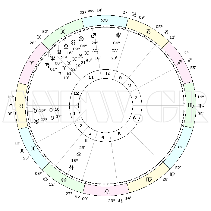 | | ΘΕΣΕΙΣ ΠΛΑΝΗΤΩΝ ΑΣΤΡΟΛΟΓΙΚΟΥ ΧΑΡΤΗ ΤΗΣ ΣΤΙΓΜΗΣ ΑΥΤΗΣ | | | | Πλανήτης | Ζώδιο | Μοίρες | Δεκαήμ. | Σε οίκο | Απόκλιση | | Ακμές των οίκων | | Ηλιος | Ιχθείς | 04°39' | Πρώτο | 12 | 09 S 48 | | 1ος | 08°22' | Κριός | | Σελήνη | Ταύρος | 18°13' | Δεύτερο | 2 | 22 N 00 | | 2ος | 16°32' | Ταύρος | | Ερμής | Ιχθείς | 21°50' | Τρίτο | 12 | 01 S 20 | | 3ος | 12°43' | Δίδυμοι | | Αφροδίτη | Ιχθείς | 16°05' | Δεύτερο | 12 | 06 S 48 | | 4ος | 04°43' | Καρκίνος | | Αρης | Υδροχόος | 24°14' | Τρίτο | 11 | 14 S 28 | | 5ος | 27°26' | Καρκίνος | | Δίας | Καρκίνος | 15°30'R | Δεύτερο | 4 | 22 N 52 | | 6ος | 26°11' | Λέων | | Κρόνος | Κριός | 01°10' | Πρώτο | 12 | 01 S 30 | | 7ος | 08°22' | Ζυγός | | Ουρανός | Ταύρος | 27°37' | Τρίτο | 2 | 19 N 27 | | 8ος | 16°32' | Σκορπιός | | Ποσειδώνας | Κριός | 00°51' | Πρώτο | 12 | 00 S 52 | | 9ος | 12°43' | Τοξότης | | Πλούτωνας | Υδροχόος | 04°23' | Πρώτο | 11 | 22 S 54 | | 10ος | 04°43' | Αιγόκερως | | Β. Δεσμός | Ιχθείς | 09°21' | Πρώτο | 12 | 08 S 04 | | 11ος | 27°26' | Αιγόκερως | | Ωροσκόπος | Κριός | 08°22' | Πρώτο | | | 12ος | 26°11' | Υδροχόος | | Μεσουράνημα | Αιγόκερως | 04°43' | Πρώτο | | | |