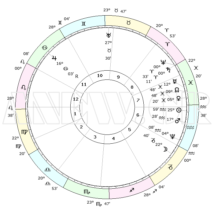 | | ΘΕΣΕΙΣ ΠΛΑΝΗΤΩΝ ΑΣΤΡΟΛΟΓΙΚΟΥ ΧΑΡΤΗ ΤΗΣ ΣΤΙΓΜΗΣ ΑΥΤΗΣ | | | | Πλανήτης | Ζώδιο | Μοίρες | Δεκαήμ. | Σε οίκο | Απόκλιση | | Ακμές των οίκων | | Ηλιος | Υδροχόος | 25°55' | Τρίτο | 7 | 12 S 53 | | 1ος | 08°43' | Λέων | | Σελήνη | Αιγόκερως | 21°48' | Τρίτο | 6 | 25 S 29 | | 2ος | 00°26' | Παρθένος | | Ερμής | Ιχθείς | 12°42' | Δεύτερο | 8 | 06 S 50 | | 3ος | 26°39' | Παρθένος | | Αφροδίτη | Ιχθείς | 05°15' | Πρώτο | 8 | 10 S 57 | | 4ος | 28°37' | Ζυγός | | Αρης | Υδροχόος | 17°25' | Δεύτερο | 7 | 16 S 38 | | 5ος | 04°18' | Τοξότης | | Δίας | Καρκίνος | 16°03'R | Δεύτερο | 12 | 22 N 48 | | 6ος | 08°38' | Αιγόκερως | | Κρόνος | Κριός | 00°11' | Πρώτο | 9 | 01 S 54 | | 7ος | 08°43' | Υδροχόος | | Ουρανός | Ταύρος | 27°30' | Τρίτο | 10 | 19 N 25 | | 8ος | 00°26' | Ιχθείς | | Ποσειδώνας | Κριός | 00°33' | Πρώτο | 9 | 00 S 59 | | 9ος | 26°39' | Ιχθείς | | Πλούτωνας | Υδροχόος | 04°07' | Πρώτο | 6 | 22 S 57 | | 10ος | 28°37' | Κριός | | Β. Δεσμός | Ιχθείς | 09°48' | Πρώτο | 8 | 07 S 53 | | 11ος | 04°18' | Δίδυμοι | | Ωροσκόπος | Λέων | 08°43' | Πρώτο | | | 12ος | 08°38' | Καρκίνος | | Μεσουράνημα | Κριός | 28°37' | Τρίτο | | | |