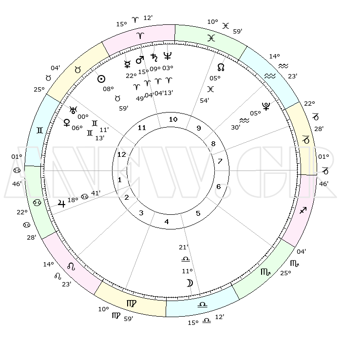 | | ΘΕΣΕΙΣ ΠΛΑΝΗΤΩΝ ΑΣΤΡΟΛΟΓΙΚΟΥ ΧΑΡΤΗ ΤΗΣ ΣΤΙΓΜΗΣ ΑΥΤΗΣ | | | | Πλανήτης | Ζώδιο | Μοίρες | Δεκαήμ. | Σε οίκο | Απόκλιση | | Ακμές των οίκων | | Ηλιος | Ταύρος | 08°57' | Πρώτο | 12 | 14 N 29 | | 1ος | 18°11' | Δίδυμοι | | Σελήνη | Ζυγός | 10°52' | Δεύτερο | 5 | 06 S 53 | | 2ος | 10°02' | Καρκίνος | | Ερμής | Κριός | 22°45' | Τρίτο | 11 | 06 N 54 | | 3ος | 01°19' | Λέων | | Αφροδίτη | Δίδυμοι | 06°10' | Πρώτο | 12 | 22 N 08 | | 4ος | 25°55' | Λέων | | Αρης | Κριός | 15°02' | Δεύτερο | 11 | 05 N 06 | | 5ος | 27°45' | Παρθένος | | Δίας | Καρκίνος | 18°41' | Δεύτερο | 2 | 22 N 31 | | 6ος | 08°00' | Σκορπιός | | Κρόνος | Κριός | 09°04' | Πρώτο | 11 | 01 N 36 | | 7ος | 18°11' | Τοξότης | | Ουρανός | Δίδυμοι | 00°11' | Πρώτο | 12 | 20 N 01 | | 8ος | 10°02' | Αιγόκερως | | Ποσειδώνας | Κριός | 03°12' | Πρώτο | 11 | 00 N 04 | | 9ος | 01°19' | Υδροχόος | | Πλούτωνας | Υδροχόος | 05°30' | Πρώτο | 9 | 22 S 49 | | 10ος | 25°55' | Υδροχόος | | Β. Δεσμός | Ιχθείς | 05°54' | Πρώτο | 10 | 09 S 21 | | 11ος | 27°45' | Ιχθείς | | Ωροσκόπος | Δίδυμοι | 18°11' | Δεύτερο | | | 12ος | 08°00' | Ταύρος | | Μεσουράνημα | Υδροχόος | 25°55' | Τρίτο | | | |