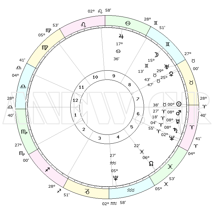 | | ΘΕΣΕΙΣ ΠΛΑΝΗΤΩΝ ΑΣΤΡΟΛΟΓΙΚΟΥ ΧΑΡΤΗ ΤΗΣ ΣΤΙΓΜΗΣ ΑΥΤΗΣ | | | | Πλανήτης | Ζώδιο | Μοίρες | Δεκαήμ. | Σε οίκο | Απόκλιση | | Ακμές των οίκων | | Ηλιος | Ταύρος | 00°34' | Πρώτο | 7 | 11 N 40 | | 1ος | 11°23' | Ζυγός | | Σελήνη | Δίδυμοι | 14°20' | Δεύτερο | 9 | 27 N 33 | | 2ος | 08°43' | Σκορπιός | | Ερμής | Κριός | 08°12' | Πρώτο | 6 | 00 N 51 | | 3ος | 09°36' | Τοξότης | | Αφροδίτη | Ταύρος | 25°43' | Τρίτο | 8 | 19 N 36 | | 4ος | 12°50' | Αιγόκερως | | Αρης | Κριός | 08°25' | Πρώτο | 6 | 02 N 28 | | 5ος | 15°46' | Υδροχόος | | Δίας | Καρκίνος | 17°35' | Δεύτερο | 10 | 22 N 39 | | 6ος | 15°42' | Ιχθείς | | Κρόνος | Κριός | 08°04' | Πρώτο | 6 | 01 N 13 | | 7ος | 11°23' | Κριός | | Ουρανός | Ταύρος | 29°43' | Τρίτο | 8 | 19 N 55 | | 8ος | 08°43' | Ταύρος | | Ποσειδώνας | Κριός | 02°55' | Πρώτο | 6 | 00 S 03 | | 9ος | 09°36' | Δίδυμοι | | Πλούτωνας | Υδροχόος | 05°27' | Πρώτο | 4 | 22 S 48 | | 10ος | 12°50' | Καρκίνος | | Β. Δεσμός | Ιχθείς | 06°22' | Πρώτο | 5 | 09 S 10 | | 11ος | 15°46' | Λέων | | Ωροσκόπος | Ζυγός | 11°23' | Δεύτερο | | | 12ος | 15°42' | Παρθένος | | Μεσουράνημα | Καρκίνος | 12°50' | Δεύτερο | | | |