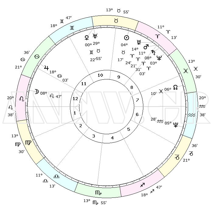 | | ΘΕΣΕΙΣ ΠΛΑΝΗΤΩΝ ΑΣΤΡΟΛΟΓΙΚΟΥ ΧΑΡΤΗ ΤΗΣ ΣΤΙΓΜΗΣ ΑΥΤΗΣ | | | | Πλανήτης | Ζώδιο | Μοίρες | Δεκαήμ. | Σε οίκο | Απόκλιση | | Ακμές των οίκων | | Ηλιος | Ταύρος | 04°13' | Πρώτο | 10 | 12 N 55 | | 1ος | 01°06' | Λέων | | Σελήνη | Λέων | 07°52' | Πρώτο | 1 | 20 N 44 | | 2ος | 22°13' | Λέων | | Ερμής | Κριός | 14°17' | Δεύτερο | 9 | 03 N 21 | | 3ος | 17°24' | Παρθένος | | Αφροδίτη | Δίδυμοι | 00°17' | Πρώτο | 11 | 20 N 48 | | 4ος | 18°34' | Ζυγός | | Αρης | Κριός | 11°18' | Δεύτερο | 9 | 03 N 37 | | 5ος | 24°36' | Σκορπιός | | Δίας | Καρκίνος | 18°03' | Δεύτερο | 12 | 22 N 36 | | 6ος | 00°07' | Αιγόκερως | | Κρόνος | Κριός | 08°30' | Πρώτο | 9 | 01 N 23 | | 7ος | 01°06' | Υδροχόος | | Ουρανός | Ταύρος | 29°55' | Τρίτο | 11 | 19 N 58 | | 8ος | 22°13' | Υδροχόος | | Ποσειδώνας | Κριός | 03°03' | Πρώτο | 9 | 00 N 00 | | 9ος | 17°24' | Ιχθείς | | Πλούτωνας | Υδροχόος | 05°28' | Πρώτο | 7 | 22 S 48 | | 10ος | 18°35' | Κριός | | Β. Δεσμός | Ιχθείς | 06°10' | Πρώτο | 8 | 09 S 15 | | 11ος | 24°36' | Ταύρος | | Ωροσκόπος | Λέων | 01°06' | Πρώτο | | | 12ος | 00°07' | Καρκίνος | | Μεσουράνημα | Κριός | 18°35' | Δεύτερο | | | |