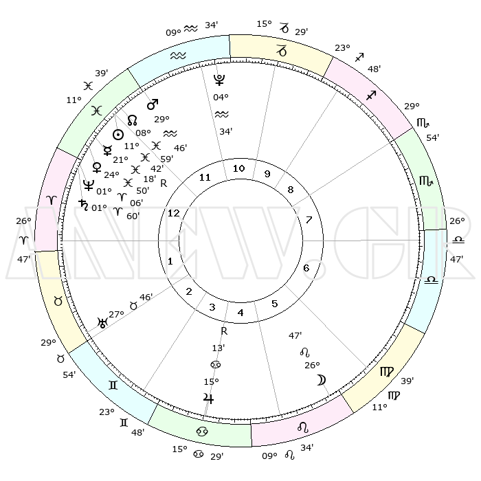 | | ΘΕΣΕΙΣ ΠΛΑΝΗΤΩΝ ΑΣΤΡΟΛΟΓΙΚΟΥ ΧΑΡΤΗ ΤΗΣ ΣΤΙΓΜΗΣ ΑΥΤΗΣ | | | | Πλανήτης | Ζώδιο | Μοίρες | Δεκαήμ. | Σε οίκο | Απόκλιση | | Ακμές των οίκων | | Ηλιος | Ιχθείς | 11°38' | Δεύτερο | 12 | 07 S 12 | | 1ος | 19°23' | Ιχθείς | | Σελήνη | Λέων | 25°54' | Τρίτο | 6 | 14 N 00 | | 2ος | 02°01' | Ταύρος | | Ερμής | Ιχθείς | 21°21'R | Τρίτο | 1 | 00 S 15 | | 3ος | 01°09' | Δίδυμοι | | Αφροδίτη | Ιχθείς | 24°45' | Τρίτο | 1 | 03 S 19 | | 4ος | 24°01' | Δίδυμοι | | Αρης | Υδροχόος | 29°43' | Τρίτο | 12 | 12 S 36 | | 5ος | 15°56' | Καρκίνος | | Δίας | Καρκίνος | 15°13'R | Δεύτερο | 4 | 22 N 54 | | 6ος | 11°48' | Λέων | | Κρόνος | Κριός | 01°59' | Πρώτο | 1 | 01 S 10 | | 7ος | 19°23' | Παρθένος | | Ουρανός | Ταύρος | 27°46' | Τρίτο | 2 | 19 N 29 | | 8ος | 02°02' | Σκορπιός | | Ποσειδώνας | Κριός | 01°06' | Πρώτο | 1 | 00 S 46 | | 9ος | 01°09' | Τοξότης | | Πλούτωνας | Υδροχόος | 04°34' | Πρώτο | 11 | 22 S 52 | | 10ος | 24°01' | Τοξότης | | Β. Δεσμός | Ιχθείς | 08°59' | Πρώτο | 12 | 08 S 12 | | 11ος | 15°56' | Αιγόκερως | | Ωροσκόπος | Ιχθείς | 19°23' | Δεύτερο | | | 12ος | 11°48' | Υδροχόος | | Μεσουράνημα | Τοξότης | 24°01' | Τρίτο | | | |