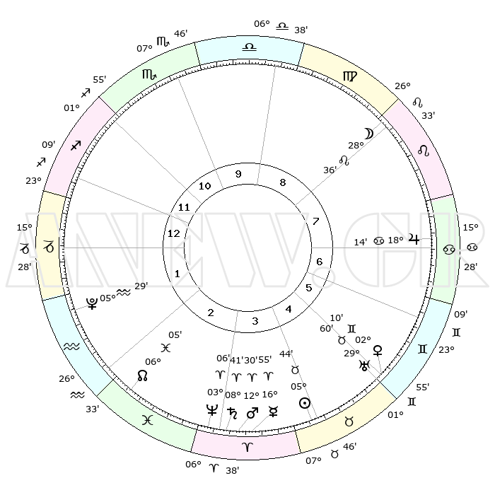 | | ΘΕΣΕΙΣ ΠΛΑΝΗΤΩΝ ΑΣΤΡΟΛΟΓΙΚΟΥ ΧΑΡΤΗ ΤΗΣ ΣΤΙΓΜΗΣ ΑΥΤΗΣ | | | | Πλανήτης | Ζώδιο | Μοίρες | Δεκαήμ. | Σε οίκο | Απόκλιση | | Ακμές των οίκων | | Ηλιος | Ταύρος | 05°40' | Πρώτο | 4 | 13 N 25 | | 1ος | 25°22' | Τοξότης | | Σελήνη | Λέων | 27°49' | Τρίτο | 8 | 13 N 01 | | 2ος | 01°22' | Υδροχόος | | Ερμής | Κριός | 16°49' | Δεύτερο | 4 | 04 N 24 | | 3ος | 10°57' | Ιχθείς | | Αφροδίτη | Δίδυμοι | 02°05' | Πρώτο | 5 | 21 N 14 | | 4ος | 15°35' | Κριός | | Αρης | Κριός | 12°27' | Δεύτερο | 3 | 04 N 04 | | 5ος | 12°39' | Ταύρος | | Δίας | Καρκίνος | 18°14' | Δεύτερο | 7 | 22 N 35 | | 6ος | 04°48' | Δίδυμοι | | Κρόνος | Κριός | 08°41' | Πρώτο | 3 | 01 N 27 | | 7ος | 25°22' | Δίδυμοι | | Ουρανός | Ταύρος | 29°60' | Τρίτο | 5 | 19 N 59 | | 8ος | 01°22' | Λέων | | Ποσειδώνας | Κριός | 03°06' | Πρώτο | 3 | 00 N 01 | | 9ος | 10°57' | Παρθένος | | Πλούτωνας | Υδροχόος | 05°29' | Πρώτο | 2 | 22 S 48 | | 10ος | 15°35' | Ζυγός | | Β. Δεσμός | Ιχθείς | 06°05' | Πρώτο | 2 | 09 S 17 | | 11ος | 12°39' | Σκορπιός | | Ωροσκόπος | Τοξότης | 25°22' | Τρίτο | | | 12ος | 04°48' | Τοξότης | | Μεσουράνημα | Ζυγός | 15°35' | Δεύτερο | | | |