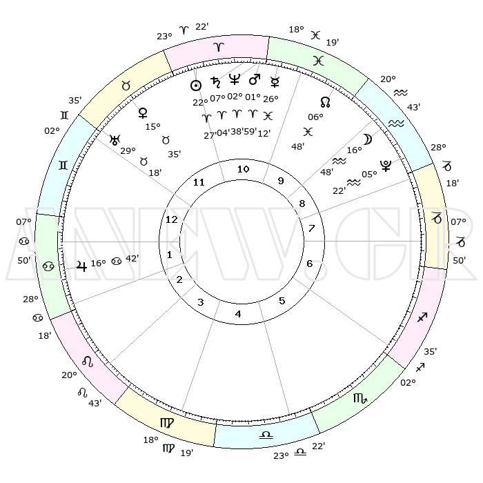 | | ΘΕΣΕΙΣ ΠΛΑΝΗΤΩΝ ΑΣΤΡΟΛΟΓΙΚΟΥ ΧΑΡΤΗ ΤΗΣ ΣΤΙΓΜΗΣ ΑΥΤΗΣ | | | | Πλανήτης | Ζώδιο | Μοίρες | Δεκαήμ. | Σε οίκο | Απόκλιση | | Ακμές των οίκων | | Ηλιος | Κριός | 22°23' | Τρίτο | 11 | 08 N 43 | | 1ος | 15°10' | Δίδυμοι | | Σελήνη | Υδροχόος | 15°57' | Δεύτερο | 9 | 17 S 55 | | 2ος | 07°24' | Καρκίνος | | Ερμής | Ιχθείς | 26°07' | Τρίτο | 11 | 03 S 49 | | 3ος | 28°38' | Καρκίνος | | Αφροδίτη | Ταύρος | 15°30' | Δεύτερο | 12 | 16 N 31 | | 4ος | 22°51' | Λέων | | Αρης | Κριός | 01°56' | Πρώτο | 11 | 00 S 09 | | 5ος | 24°07' | Παρθένος | | Δίας | Καρκίνος | 16°42' | Δεύτερο | 2 | 22 N 46 | | 6ος | 04°14' | Σκορπιός | | Κρόνος | Κριός | 07°03' | Πρώτο | 11 | 00 N 50 | | 7ος | 15°10' | Τοξότης | | Ουρανός | Ταύρος | 29°17' | Τρίτο | 12 | 19 N 50 | | 8ος | 07°24' | Αιγόκερως | | Ποσειδώνας | Κριός | 02°38' | Πρώτο | 11 | 00 S 10 | | 9ος | 28°38' | Αιγόκερως | | Πλούτωνας | Υδροχόος | 05°22' | Πρώτο | 9 | 22 S 47 | | 10ος | 22°51' | Υδροχόος | | Β. Δεσμός | Ιχθείς | 06°48' | Πρώτο | 10 | 09 S 01 | | 11ος | 24°07' | Ιχθείς | | Ωροσκόπος | Δίδυμοι | 15°10' | Δεύτερο | | | 12ος | 04°14' | Ταύρος | | Μεσουράνημα | Υδροχόος | 22°51' | Τρίτο | | | |