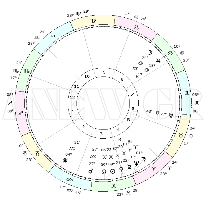 | | ΘΕΣΕΙΣ ΠΛΑΝΗΤΩΝ ΑΣΤΡΟΛΟΓΙΚΟΥ ΧΑΡΤΗ ΤΗΣ ΣΤΙΓΜΗΣ ΑΥΤΗΣ | | | | Πλανήτης | Ζώδιο | Μοίρες | Δεκαήμ. | Σε οίκο | Απόκλιση | | Ακμές των οίκων | | Ηλιος | Ιχθείς | 09°20' | Πρώτο | 4 | 08 S 04 | | 1ος | 21°20' | Σκορπιός | | Σελήνη | Καρκίνος | 24°05' | Τρίτο | 8 | 24 N 58 | | 2ος | 21°25' | Τοξότης | | Ερμής | Ιχθείς | 22°21'R | Τρίτο | 4 | 00 S 10 | | 3ος | 25°45' | Αιγόκερως | | Αφροδίτη | Ιχθείς | 21°53' | Τρίτο | 4 | 04 S 29 | | 4ος | 01°26' | Ιχθείς | | Αρης | Υδροχόος | 27°54' | Τρίτο | 3 | 13 S 14 | | 5ος | 03°24' | Κριός | | Δίας | Καρκίνος | 15°17'R | Δεύτερο | 8 | 22 N 54 | | 6ος | 29°37' | Κριός | | Κρόνος | Κριός | 01°43' | Πρώτο | 4 | 01 S 17 | | 7ος | 21°20' | Ταύρος | | Ουρανός | Ταύρος | 27°43' | Τρίτο | 7 | 19 N 28 | | 8ος | 21°25' | Δίδυμοι | | Ποσειδώνας | Κριός | 01°01' | Πρώτο | 4 | 00 S 48 | | 9ος | 25°45' | Καρκίνος | | Πλούτωνας | Υδροχόος | 04°30' | Πρώτο | 3 | 22 S 53 | | 10ος | 01°26' | Παρθένος | | Β. Δεσμός | Ιχθείς | 09°06' | Πρώτο | 4 | 08 S 09 | | 11ος | 03°24' | Ζυγός | | Ωροσκόπος | Σκορπιός | 21°20' | Τρίτο | | | 12ος | 29°37' | Ζυγός | | Μεσουράνημα | Παρθένος | 01°26' | Πρώτο | | | |