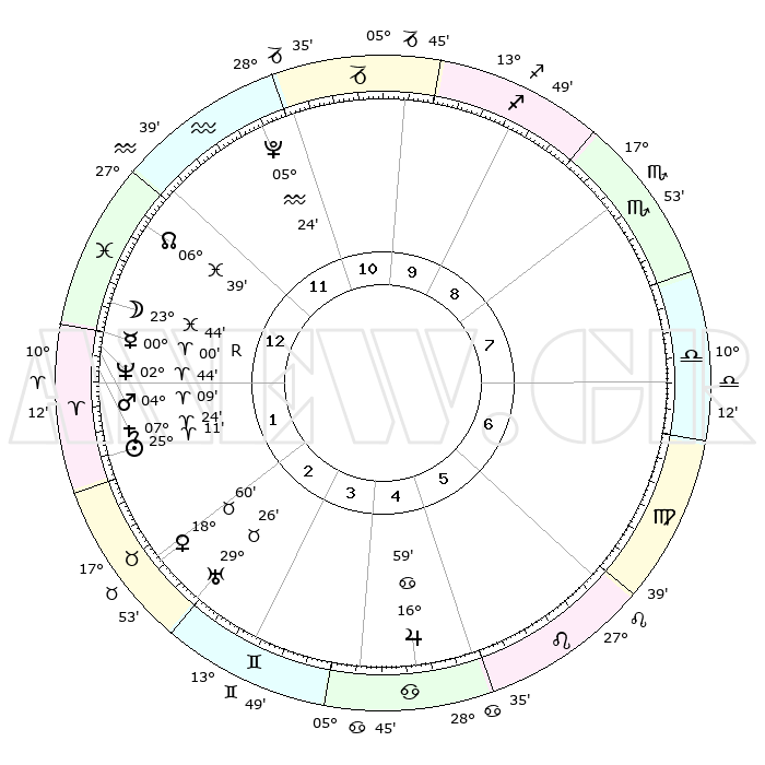 | | ΘΕΣΕΙΣ ΠΛΑΝΗΤΩΝ ΑΣΤΡΟΛΟΓΙΚΟΥ ΧΑΡΤΗ ΤΗΣ ΣΤΙΓΜΗΣ ΑΥΤΗΣ | | | | Πλανήτης | Ζώδιο | Μοίρες | Δεκαήμ. | Σε οίκο | Απόκλιση | | Ακμές των οίκων | | Ηλιος | Κριός | 25°07' | Τρίτο | 2 | 09 N 43 | | 1ος | 05°07' | Ιχθείς | | Σελήνη | Ιχθείς | 22°54' | Τρίτο | 1 | 01 S 37 | | 2ος | 20°03' | Κριός | | Ερμής | Ιχθείς | 29°55' | Τρίτο | 1 | 02 S 25 | | 3ος | 21°46' | Ταύρος | | Αφροδίτη | Ταύρος | 18°55' | Δεύτερο | 2 | 17 N 37 | | 4ος | 15°41' | Δίδυμοι | | Αρης | Κριός | 04°06' | Πρώτο | 1 | 00 N 44 | | 5ος | 07°22' | Καρκίνος | | Δίας | Καρκίνος | 16°58' | Δεύτερο | 5 | 22 N 44 | | 6ος | 01°29' | Λέων | | Κρόνος | Κριός | 07°24' | Πρώτο | 1 | 00 N 58 | | 7ος | 05°07' | Παρθένος | | Ουρανός | Ταύρος | 29°26' | Τρίτο | 3 | 19 N 52 | | 8ος | 20°03' | Ζυγός | | Ποσειδώνας | Κριός | 02°44' | Πρώτο | 1 | 00 S 07 | | 9ος | 21°46' | Σκορπιός | | Πλούτωνας | Υδροχόος | 05°24' | Πρώτο | 12 | 22 S 47 | | 10ος | 15°41' | Τοξότης | | Β. Δεσμός | Ιχθείς | 06°39' | Πρώτο | 1 | 09 S 04 | | 11ος | 07°22' | Αιγόκερως | | Ωροσκόπος | Ιχθείς | 05°07' | Πρώτο | | | 12ος | 01°29' | Υδροχόος | | Μεσουράνημα | Τοξότης | 15°41' | Δεύτερο | | | |
