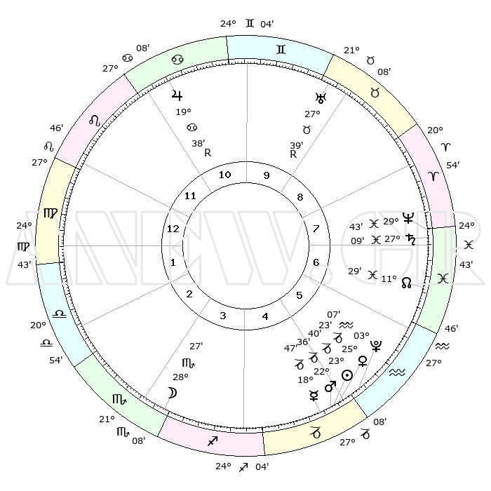 | | ΘΕΣΕΙΣ ΠΛΑΝΗΤΩΝ ΑΣΤΡΟΛΟΓΙΚΟΥ ΧΑΡΤΗ ΤΗΣ ΣΤΙΓΜΗΣ ΑΥΤΗΣ | | | | Πλανήτης | Ζώδιο | Μοίρες | Δεκαήμ. | Σε οίκο | Απόκλιση | | Ακμές των οίκων | | Ηλιος | Αιγόκερως | 23°36' | Τρίτο | 5 | 21 S 22 | | 1ος | 03°43' | Παρθένος | | Σελήνη | Σκορπιός | 27°36' | Τρίτο | 3 | 24 S 29 | | 2ος | 27°58' | Παρθένος | | Ερμής | Αιγόκερως | 18°40' | Δεύτερο | 5 | 23 S 50 | | 3ος | 26°57' | Ζυγός | | Αφροδίτη | Αιγόκερως | 25°18' | Τρίτο | 5 | 22 S 00 | | 4ος | 29°54' | Σκορπιός | | Αρης | Αιγόκερως | 22°33' | Τρίτο | 5 | 22 S 30 | | 5ος | 03°51' | Αιγόκερως | | Δίας | Καρκίνος | 19°39'R | Δεύτερο | 11 | 22 N 16 | | 6ος | 05°32' | Υδροχόος | | Κρόνος | Ιχθείς | 27°09' | Τρίτο | 7 | 03 S 10 | | 7ος | 03°43' | Ιχθείς | | Ουρανός | Ταύρος | 27°39'R | Τρίτο | 9 | 19 N 27 | | 8ος | 27°58' | Ιχθείς | | Ποσειδώνας | Ιχθείς | 29°43' | Τρίτο | 8 | 01 S 20 | | 9ος | 26°57' | Κριός | | Πλούτωνας | Υδροχόος | 03°07' | Πρώτο | 5 | 23 S 08 | | 10ος | 29°54' | Ταύρος | | Β. Δεσμός | Ιχθείς | 11°30' | Δεύτερο | 7 | 07 S 15 | | 11ος | 03°51' | Καρκίνος | | Ωροσκόπος | Παρθένος | 03°43' | Πρώτο | | | 12ος | 05°32' | Λέων | | Μεσουράνημα | Ταύρος | 29°54' | Τρίτο | | | |