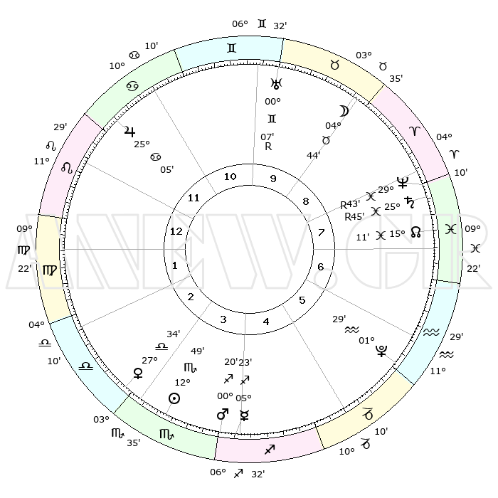 | | ΘΕΣΕΙΣ ΠΛΑΝΗΤΩΝ ΑΣΤΡΟΛΟΓΙΚΟΥ ΧΑΡΤΗ ΤΗΣ ΣΤΙΓΜΗΣ ΑΥΤΗΣ | | | | Πλανήτης | Ζώδιο | Μοίρες | Δεκαήμ. | Σε οίκο | Απόκλιση | | Ακμές των οίκων | | Ηλιος | Σκορπιός | 12°42' | Δεύτερο | 4 | 15 S 39 | | 1ος | 05°29' | Λέων | | Σελήνη | Ταύρος | 02°57' | Πρώτο | 10 | 15 N 56 | | 2ος | 26°55' | Λέων | | Ερμής | Τοξότης | 05°19' | Πρώτο | 5 | 23 S 58 | | 3ος | 22°43' | Παρθένος | | Αφροδίτη | Ζυγός | 27°25' | Τρίτο | 4 | 09 S 14 | | 4ος | 24°22' | Ζυγός | | Αρης | Τοξότης | 00°15' | Πρώτο | 5 | 20 S 37 | | 5ος | 00°13' | Τοξότης | | Δίας | Καρκίνος | 25°05' | Τρίτο | 12 | 21 N 12 | | 6ος | 05°03' | Αιγόκερως | | Κρόνος | Ιχθείς | 25°45'R | Τρίτο | 9 | 03 S 56 | | 7ος | 05°29' | Υδροχόος | | Ουρανός | Δίδυμοι | 00°07'R | Πρώτο | 10 | 19 N 58 | | 8ος | 26°55' | Υδροχόος | | Ποσειδώνας | Ιχθείς | 29°43'R | Τρίτο | 9 | 01 S 22 | | 9ος | 22°43' | Ιχθείς | | Πλούτωνας | Υδροχόος | 01°29' | Πρώτο | 6 | 23 S 30 | | 10ος | 24°22' | Κριός | | Β. Δεσμός | Ιχθείς | 15°12' | Δεύτερο | 8 | 05 S 50 | | 11ος | 00°13' | Δίδυμοι | | Ωροσκόπος | Λέων | 05°29' | Πρώτο | | | 12ος | 05°03' | Καρκίνος | | Μεσουράνημα | Κριός | 24°22' | Τρίτο | | | |
