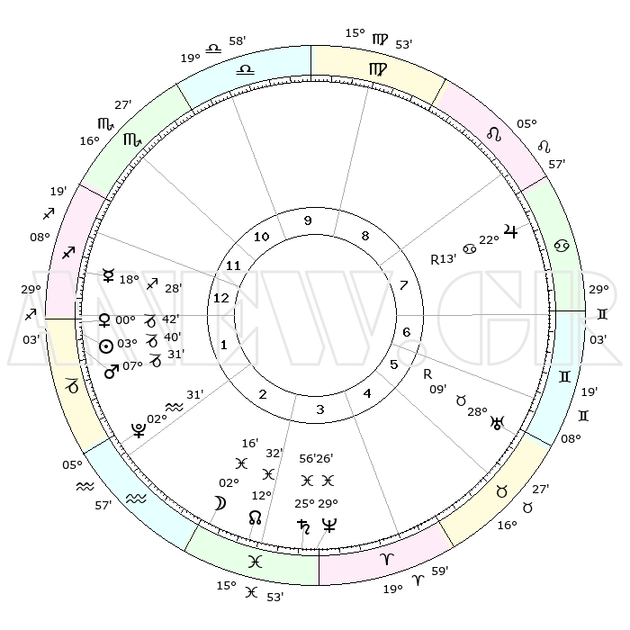 | | ΘΕΣΕΙΣ ΠΛΑΝΗΤΩΝ ΑΣΤΡΟΛΟΓΙΚΟΥ ΧΑΡΤΗ ΤΗΣ ΣΤΙΓΜΗΣ ΑΥΤΗΣ | | | | Πλανήτης | Ζώδιο | Μοίρες | Δεκαήμ. | Σε οίκο | Απόκλιση | | Ακμές των οίκων | | Ηλιος | Αιγόκερως | 03°36' | Πρώτο | 1 | 23 S 23 | | 1ος | 07°04' | Τοξότης | | Σελήνη | Ιχθείς | 01°22' | Πρώτο | 3 | 11 S 48 | | 2ος | 09°16' | Αιγόκερως | | Ερμής | Τοξότης | 18°22' | Δεύτερο | 1 | 22 S 41 | | 3ος | 16°10' | Υδροχόος | | Αφροδίτη | Αιγόκερως | 00°36' | Πρώτο | 1 | 23 S 40 | | 4ος | 22°14' | Ιχθείς | | Αρης | Αιγόκερως | 07°28' | Πρώτο | 1 | 24 S 04 | | 5ος | 22°18' | Κριός | | Δίας | Καρκίνος | 22°13'R | Τρίτο | 8 | 21 N 49 | | 6ος | 16°25' | Ταύρος | | Κρόνος | Ιχθείς | 25°56' | Τρίτο | 4 | 03 S 43 | | 7ος | 07°04' | Δίδυμοι | | Ουρανός | Ταύρος | 28°09'R | Τρίτο | 6 | 19 N 33 | | 8ος | 09°16' | Καρκίνος | | Ποσειδώνας | Ιχθείς | 29°26' | Τρίτο | 4 | 01 S 27 | | 9ος | 16°10' | Λέων | | Πλούτωνας | Υδροχόος | 02°31' | Πρώτο | 2 | 23 S 16 | | 10ος | 22°14' | Παρθένος | | Β. Δεσμός | Ιχθείς | 12°32' | Δεύτερο | 3 | 06 S 51 | | 11ος | 22°18' | Ζυγός | | Ωροσκόπος | Τοξότης | 07°04' | Πρώτο | | | 12ος | 16°25' | Σκορπιός | | Μεσουράνημα | Παρθένος | 22°14' | Τρίτο | | | |
