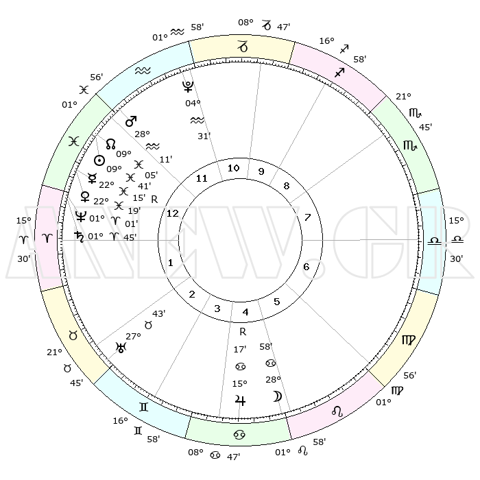 | | ΘΕΣΕΙΣ ΠΛΑΝΗΤΩΝ ΑΣΤΡΟΛΟΓΙΚΟΥ ΧΑΡΤΗ ΤΗΣ ΣΤΙΓΜΗΣ ΑΥΤΗΣ | | | | Πλανήτης | Ζώδιο | Μοίρες | Δεκαήμ. | Σε οίκο | Απόκλιση | | Ακμές των οίκων | | Ηλιος | Ιχθείς | 09°37' | Πρώτο | 12 | 07 S 58 | | 1ος | 12°13' | Ιχθείς | | Σελήνη | Καρκίνος | 28°11' | Τρίτο | 5 | 23 N 54 | | 2ος | 26°09' | Κριός | | Ερμής | Ιχθείς | 22°16'R | Τρίτο | 1 | 00 S 09 | | 3ος | 26°32' | Ταύρος | | Αφροδίτη | Ιχθείς | 22°15' | Τρίτο | 1 | 04 S 20 | | 4ος | 19°53' | Δίδυμοι | | Αρης | Υδροχόος | 28°08' | Τρίτο | 12 | 13 S 09 | | 5ος | 11°39' | Καρκίνος | | Δίας | Καρκίνος | 15°17'R | Δεύτερο | 5 | 22 N 54 | | 6ος | 06°36' | Λέων | | Κρόνος | Κριός | 01°45' | Πρώτο | 1 | 01 S 16 | | 7ος | 12°13' | Παρθένος | | Ουρανός | Ταύρος | 27°43' | Τρίτο | 3 | 19 N 28 | | 8ος | 26°09' | Ζυγός | | Ποσειδώνας | Κριός | 01°01' | Πρώτο | 1 | 00 S 48 | | 9ος | 26°32' | Σκορπιός | | Πλούτωνας | Υδροχόος | 04°31' | Πρώτο | 11 | 22 S 53 | | 10ος | 19°53' | Τοξότης | | Β. Δεσμός | Ιχθείς | 09°05' | Πρώτο | 12 | 08 S 10 | | 11ος | 11°39' | Αιγόκερως | | Ωροσκόπος | Ιχθείς | 12°13' | Δεύτερο | | | 12ος | 06°36' | Υδροχόος | | Μεσουράνημα | Τοξότης | 19°53' | Δεύτερο | | | |