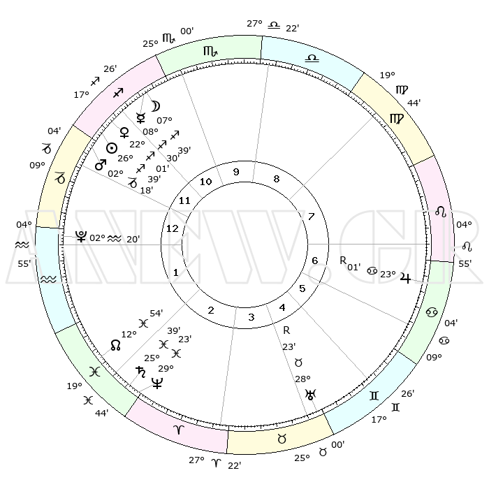 | | ΘΕΣΕΙΣ ΠΛΑΝΗΤΩΝ ΑΣΤΡΟΛΟΓΙΚΟΥ ΧΑΡΤΗ ΤΗΣ ΣΤΙΓΜΗΣ ΑΥΤΗΣ | | | | Πλανήτης | Ζώδιο | Μοίρες | Δεκαήμ. | Σε οίκο | Απόκλιση | | Ακμές των οίκων | | Ηλιος | Τοξότης | 26°20' | Τρίτο | 3 | 23 S 23 | | 1ος | 22°17' | Ζυγός | | Σελήνη | Τοξότης | 03°52' | Πρώτο | 2 | 25 S 46 | | 2ος | 20°15' | Σκορπιός | | Ερμής | Τοξότης | 08°04' | Πρώτο | 2 | 20 S 30 | | 3ος | 21°40' | Τοξότης | | Αφροδίτη | Τοξότης | 21°37' | Τρίτο | 2 | 23 S 08 | | 4ος | 25°23' | Αιγόκερως | | Αρης | Αιγόκερως | 02°03' | Πρώτο | 3 | 24 S 13 | | 5ος | 28°20' | Υδροχόος | | Δίας | Καρκίνος | 23°03'R | Τρίτο | 9 | 21 N 40 | | 6ος | 27°38' | Ιχθείς | | Κρόνος | Ιχθείς | 25°38' | Τρίτο | 5 | 03 S 51 | | 7ος | 22°17' | Κριός | | Ουρανός | Ταύρος | 28°23'R | Τρίτο | 8 | 19 N 36 | | 8ος | 20°15' | Ταύρος | | Ποσειδώνας | Ιχθείς | 29°23' | Τρίτο | 6 | 01 S 28 | | 9ος | 21°40' | Δίδυμοι | | Πλούτωνας | Υδροχόος | 02°19' | Πρώτο | 4 | 23 S 18 | | 10ος | 25°23' | Καρκίνος | | Β. Δεσμός | Ιχθείς | 12°55' | Δεύτερο | 5 | 06 S 43 | | 11ος | 28°20' | Λέων | | Ωροσκόπος | Ζυγός | 22°17' | Τρίτο | | | 12ος | 27°38' | Παρθένος | | Μεσουράνημα | Καρκίνος | 25°23' | Τρίτο | | | |