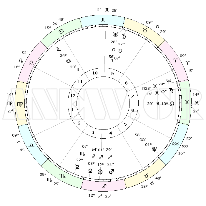| | ΘΕΣΕΙΣ ΠΛΑΝΗΤΩΝ ΑΣΤΡΟΛΟΓΙΚΟΥ ΧΑΡΤΗ ΤΗΣ ΣΤΙΓΜΗΣ ΑΥΤΗΣ | | | | Πλανήτης | Ζώδιο | Μοίρες | Δεκαήμ. | Σε οίκο | Απόκλιση | | Ακμές των οίκων | | Ηλιος | Τοξότης | 11°58' | Δεύτερο | 4 | 22 S 13 | | 1ος | 03°41' | Παρθένος | | Σελήνη | Ταύρος | 26°33' | Τρίτο | 9 | 24 N 01 | | 2ος | 27°55' | Παρθένος | | Ερμής | Σκορπιός | 22°06' | Τρίτο | 3 | 15 S 47 | | 3ος | 26°54' | Ζυγός | | Αφροδίτη | Τοξότης | 03°51' | Πρώτο | 4 | 20 S 20 | | 4ος | 29°51' | Σκορπιός | | Αρης | Τοξότης | 21°27' | Τρίτο | 4 | 23 S 51 | | 5ος | 03°48' | Αιγόκερως | | Δίας | Καρκίνος | 24°20'R | Τρίτο | 11 | 21 N 24 | | 6ος | 05°29' | Υδροχόος | | Κρόνος | Ιχθείς | 25°19' | Τρίτο | 7 | 04 S 02 | | 7ος | 03°41' | Ιχθείς | | Ουρανός | Ταύρος | 28°56'R | Τρίτο | 9 | 19 N 43 | | 8ος | 27°55' | Ιχθείς | | Ποσειδώνας | Ιχθείς | 29°23'R | Τρίτο | 8 | 01 S 29 | | 9ος | 26°54' | Κριός | | Πλούτωνας | Υδροχόος | 01°58' | Πρώτο | 5 | 23 S 23 | | 10ος | 29°51' | Ταύρος | | Β. Δεσμός | Ιχθείς | 13°39' | Δεύτερο | 7 | 06 S 26 | | 11ος | 03°48' | Καρκίνος | | Ωροσκόπος | Παρθένος | 03°41' | Πρώτο | | | 12ος | 05°29' | Λέων | | Μεσουράνημα | Ταύρος | 29°51' | Τρίτο | | | |