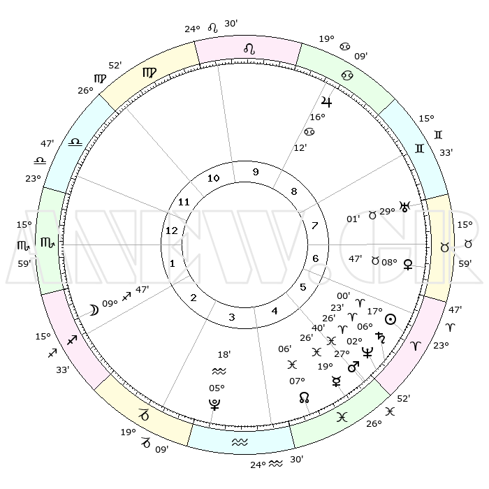 | | ΘΕΣΕΙΣ ΠΛΑΝΗΤΩΝ ΑΣΤΡΟΛΟΓΙΚΟΥ ΧΑΡΤΗ ΤΗΣ ΣΤΙΓΜΗΣ ΑΥΤΗΣ | | | | Πλανήτης | Ζώδιο | Μοίρες | Δεκαήμ. | Σε οίκο | Απόκλιση | | Ακμές των οίκων | | Ηλιος | Κριός | 16°56' | Δεύτερο | 6 | 06 N 39 | | 1ος | 26°51' | Ζυγός | | Σελήνη | Τοξότης | 09°00' | Πρώτο | 2 | 26 S 54 | | 2ος | 25°04' | Σκορπιός | | Ερμής | Ιχθείς | 19°22' | Δεύτερο | 5 | 06 S 06 | | 3ος | 26°47' | Τοξότης | | Αφροδίτη | Ταύρος | 08°42' | Πρώτο | 7 | 14 N 13 | | 4ος | 00°46' | Υδροχόος | | Αρης | Ιχθείς | 27°36' | Τρίτο | 5 | 01 S 53 | | 5ος | 03°43' | Ιχθείς | | Δίας | Καρκίνος | 16°12' | Δεύτερο | 9 | 22 N 49 | | 6ος | 02°40' | Κριός | | Κρόνος | Κριός | 06°22' | Πρώτο | 6 | 00 N 34 | | 7ος | 26°51' | Κριός | | Ουρανός | Ταύρος | 29°01' | Τρίτο | 8 | 19 N 46 | | 8ος | 25°04' | Ταύρος | | Ποσειδώνας | Κριός | 02°25' | Πρώτο | 5 | 00 S 14 | | 9ος | 26°47' | Δίδυμοι | | Πλούτωνας | Υδροχόος | 05°18' | Πρώτο | 4 | 22 S 47 | | 10ος | 00°46' | Λέων | | Β. Δεσμός | Ιχθείς | 07°06' | Πρώτο | 5 | 08 S 54 | | 11ος | 03°43' | Παρθένος | | Ωροσκόπος | Ζυγός | 26°51' | Τρίτο | | | 12ος | 02°40' | Ζυγός | | Μεσουράνημα | Λέων | 00°46' | Πρώτο | | | |