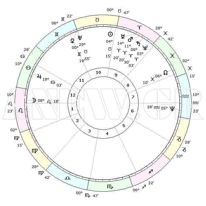| | ΘΕΣΕΙΣ ΠΛΑΝΗΤΩΝ ΑΣΤΡΟΛΟΓΙΚΟΥ ΧΑΡΤΗ ΤΗΣ ΣΤΙΓΜΗΣ ΑΥΤΗΣ | | | | Πλανήτης | Ζώδιο | Μοίρες | Δεκαήμ. | Σε οίκο | Απόκλιση | | Ακμές των οίκων | | Ηλιος | Ταύρος | 04°12' | Πρώτο | 10 | 12 N 55 | | 1ος | 21°28' | Καρκίνος | | Σελήνη | Λέων | 07°25' | Πρώτο | 1 | 20 N 53 | | 2ος | 12°04' | Λέων | | Ερμής | Κριός | 14°14' | Δεύτερο | 10 | 03 N 20 | | 3ος | 05°59' | Παρθένος | | Αφροδίτη | Δίδυμοι | 00°14' | Πρώτο | 11 | 20 N 47 | | 4ος | 05°50' | Ζυγός | | Αρης | Κριός | 11°17' | Δεύτερο | 10 | 03 N 36 | | 5ος | 11°52' | Σκορπιός | | Δίας | Καρκίνος | 18°02' | Δεύτερο | 12 | 22 N 36 | | 6ος | 19°01' | Τοξότης | | Κρόνος | Κριός | 08°30' | Πρώτο | 10 | 01 N 23 | | 7ος | 21°28' | Αιγόκερως | | Ουρανός | Ταύρος | 29°55' | Τρίτο | 11 | 19 N 58 | | 8ος | 12°04' | Υδροχόος | | Ποσειδώνας | Κριός | 03°03' | Πρώτο | 9 | 00 N 00 | | 9ος | 05°59' | Ιχθείς | | Πλούτωνας | Υδροχόος | 05°28' | Πρώτο | 7 | 22 S 48 | | 10ος | 05°50' | Κριός | | Β. Δεσμός | Ιχθείς | 06°10' | Πρώτο | 9 | 09 S 15 | | 11ος | 11°52' | Ταύρος | | Ωροσκόπος | Καρκίνος | 21°28' | Τρίτο | | | 12ος | 19°01' | Δίδυμοι | | Μεσουράνημα | Κριός | 05°50' | Πρώτο | | | |