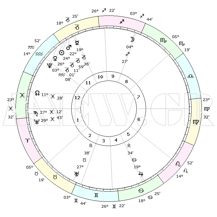 | | ΘΕΣΕΙΣ ΠΛΑΝΗΤΩΝ ΑΣΤΡΟΛΟΓΙΚΟΥ ΧΑΡΤΗ ΤΗΣ ΣΤΙΓΜΗΣ ΑΥΤΗΣ | | | | Πλανήτης | Ζώδιο | Μοίρες | Δεκαήμ. | Σε οίκο | Απόκλιση | | Ακμές των οίκων | | Ηλιος | Αιγόκερως | 24°06' | Τρίτο | 12 | 21 S 17 | | 1ος | 13°37' | Υδροχόος | | Σελήνη | Τοξότης | 03°34' | Πρώτο | 10 | 25 S 51 | | 2ος | 29°15' | Ιχθείς | | Ερμής | Αιγόκερως | 19°29' | Δεύτερο | 12 | 23 S 44 | | 3ος | 05°14' | Ταύρος | | Αφροδίτη | Αιγόκερως | 25°56' | Τρίτο | 12 | 21 S 54 | | 4ος | 01°35' | Δίδυμοι | | Αρης | Αιγόκερως | 22°56' | Τρίτο | 12 | 22 S 26 | | 5ος | 23°35' | Δίδυμοι | | Δίας | Καρκίνος | 19°34'R | Δεύτερο | 6 | 22 N 16 | | 6ος | 15°44' | Καρκίνος | | Κρόνος | Ιχθείς | 27°11' | Τρίτο | 1 | 03 S 09 | | 7ος | 13°37' | Λέων | | Ουρανός | Ταύρος | 27°39'R | Τρίτο | 3 | 19 N 26 | | 8ος | 29°15' | Παρθένος | | Ποσειδώνας | Ιχθείς | 29°43' | Τρίτο | 2 | 01 S 20 | | 9ος | 05°14' | Σκορπιός | | Πλούτωνας | Υδροχόος | 03°08' | Πρώτο | 12 | 23 S 08 | | 10ος | 01°35' | Τοξότης | | Β. Δεσμός | Ιχθείς | 11°28' | Δεύτερο | 1 | 07 S 16 | | 11ος | 23°35' | Τοξότης | | Ωροσκόπος | Υδροχόος | 13°37' | Δεύτερο | | | 12ος | 15°44' | Αιγόκερως | | Μεσουράνημα | Τοξότης | 01°35' | Πρώτο | | | |