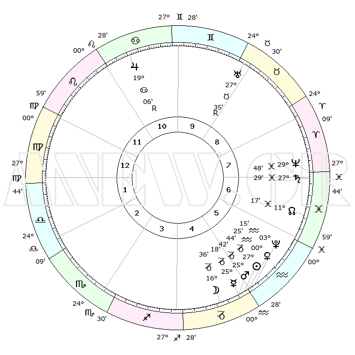 | | ΘΕΣΕΙΣ ΠΛΑΝΗΤΩΝ ΑΣΤΡΟΛΟΓΙΚΟΥ ΧΑΡΤΗ ΤΗΣ ΣΤΙΓΜΗΣ ΑΥΤΗΣ | | | | Πλανήτης | Ζώδιο | Μοίρες | Δεκαήμ. | Σε οίκο | Απόκλιση | | Ακμές των οίκων | | Ηλιος | Αιγόκερως | 27°40' | Τρίτο | 5 | 20 S 37 | | 1ος | 05°30' | Παρθένος | | Σελήνη | Αιγόκερως | 15°40' | Δεύτερο | 5 | 26 S 39 | | 2ος | 29°55' | Παρθένος | | Ερμής | Αιγόκερως | 25°10' | Τρίτο | 5 | 22 S 59 | | 3ος | 29°03' | Ζυγός | | Αφροδίτη | Υδροχόος | 00°19' | Πρώτο | 5 | 21 S 07 | | 4ος | 01°60' | Τοξότης | | Αρης | Αιγόκερως | 25°39' | Τρίτο | 5 | 21 S 59 | | 5ος | 05°50' | Αιγόκερως | | Δίας | Καρκίνος | 19°07'R | Δεύτερο | 11 | 22 N 21 | | 6ος | 07°24' | Υδροχόος | | Κρόνος | Ιχθείς | 27°28' | Τρίτο | 7 | 03 S 02 | | 7ος | 05°30' | Ιχθείς | | Ουρανός | Ταύρος | 27°35'R | Τρίτο | 9 | 19 N 26 | | 8ος | 29°55' | Ιχθείς | | Ποσειδώνας | Ιχθείς | 29°48' | Τρίτο | 7 | 01 S 18 | | 9ος | 29°03' | Κριός | | Πλούτωνας | Υδροχόος | 03°15' | Πρώτο | 5 | 23 S 07 | | 10ος | 01°60' | Δίδυμοι | | Β. Δεσμός | Ιχθείς | 11°17' | Δεύτερο | 7 | 07 S 20 | | 11ος | 05°50' | Καρκίνος | | Ωροσκόπος | Παρθένος | 05°30' | Πρώτο | | | 12ος | 07°24' | Λέων | | Μεσουράνημα | Δίδυμοι | 01°60' | Πρώτο | | | |