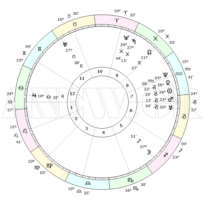 | | ΘΕΣΕΙΣ ΠΛΑΝΗΤΩΝ ΑΣΤΡΟΛΟΓΙΚΟΥ ΧΑΡΤΗ ΤΗΣ ΣΤΙΓΜΗΣ ΑΥΤΗΣ | | | | Πλανήτης | Ζώδιο | Μοίρες | Δεκαήμ. | Σε οίκο | Απόκλιση | | Ακμές των οίκων | | Ηλιος | Αιγόκερως | 24°24' | Τρίτο | 8 | 21 S 14 | | 1ος | 01°08' | Καρκίνος | | Σελήνη | Τοξότης | 06°56' | Πρώτο | 6 | 26 S 30 | | 2ος | 21°51' | Καρκίνος | | Ερμής | Αιγόκερως | 19°57' | Δεύτερο | 7 | 23 S 42 | | 3ος | 13°44' | Λέων | | Αφροδίτη | Αιγόκερως | 26°17' | Τρίτο | 8 | 21 S 50 | | 4ος | 10°13' | Παρθένος | | Αρης | Αιγόκερως | 23°09' | Τρίτο | 8 | 22 S 24 | | 5ος | 14°20' | Ζυγός | | Δίας | Καρκίνος | 19°32'R | Δεύτερο | 1 | 22 N 17 | | 6ος | 24°15' | Σκορπιός | | Κρόνος | Ιχθείς | 27°13' | Τρίτο | 10 | 03 S 09 | | 7ος | 01°08' | Αιγόκερως | | Ουρανός | Ταύρος | 27°38'R | Τρίτο | 12 | 19 N 26 | | 8ος | 21°51' | Αιγόκερως | | Ποσειδώνας | Ιχθείς | 29°44' | Τρίτο | 10 | 01 S 19 | | 9ος | 13°44' | Υδροχόος | | Πλούτωνας | Υδροχόος | 03°09' | Πρώτο | 8 | 23 S 08 | | 10ος | 10°14' | Ιχθείς | | Β. Δεσμός | Ιχθείς | 11°27' | Δεύτερο | 10 | 07 S 16 | | 11ος | 14°20' | Κριός | | Ωροσκόπος | Καρκίνος | 01°08' | Πρώτο | | | 12ος | 24°15' | Ταύρος | | Μεσουράνημα | Ιχθείς | 10°14' | Δεύτερο | | | |
