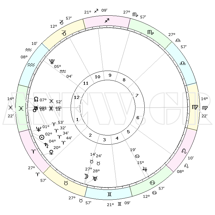 | | ΘΕΣΕΙΣ ΠΛΑΝΗΤΩΝ ΑΣΤΡΟΛΟΓΙΚΟΥ ΧΑΡΤΗ ΤΗΣ ΣΤΙΓΜΗΣ ΑΥΤΗΣ | | | | Πλανήτης | Ζώδιο | Μοίρες | Δεκαήμ. | Σε οίκο | Απόκλιση | | Ακμές των οίκων | | Ηλιος | Κριός | 02°27' | Πρώτο | 2 | 00 N 59 | | 1ος | 05°23' | Υδροχόος | | Σελήνη | Ταύρος | 26°08' | Τρίτο | 4 | 24 N 14 | | 2ος | 20°16' | Ιχθείς | | Ερμής | Ιχθείς | 08°45' | Πρώτο | 1 | 07 S 53 | | 3ος | 27°48' | Κριός | | Αφροδίτη | Κριός | 20°39' | Τρίτο | 2 | 07 N 20 | | 4ος | 25°23' | Ταύρος | | Αρης | Ιχθείς | 16°08' | Δεύτερο | 1 | 06 S 27 | | 5ος | 17°47' | Δίδυμοι | | Δίας | Καρκίνος | 15°19' | Δεύτερο | 6 | 22 N 55 | | 6ος | 09°26' | Καρκίνος | | Κρόνος | Κριός | 04°33' | Πρώτο | 2 | 00 S 09 | | 7ος | 05°23' | Λέων | | Ουρανός | Ταύρος | 28°24' | Τρίτο | 4 | 19 N 38 | | 8ος | 20°16' | Παρθένος | | Ποσειδώνας | Κριός | 01°52' | Πρώτο | 2 | 00 S 27 | | 9ος | 27°48' | Ζυγός | | Πλούτωνας | Υδροχόος | 05°03' | Πρώτο | 12 | 22 S 48 | | 10ος | 25°23' | Σκορπιός | | Β. Δεσμός | Ιχθείς | 07°53' | Πρώτο | 1 | 08 S 37 | | 11ος | 17°47' | Τοξότης | | Ωροσκόπος | Υδροχόος | 05°23' | Πρώτο | | | 12ος | 09°26' | Αιγόκερως | | Μεσουράνημα | Σκορπιός | 25°23' | Τρίτο | | | |