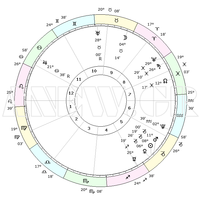 | | ΘΕΣΕΙΣ ΠΛΑΝΗΤΩΝ ΑΣΤΡΟΛΟΓΙΚΟΥ ΧΑΡΤΗ ΤΗΣ ΣΤΙΓΜΗΣ ΑΥΤΗΣ | | | | Πλανήτης | Ζώδιο | Μοίρες | Δεκαήμ. | Σε οίκο | Απόκλιση | | Ακμές των οίκων | | Ηλιος | Αιγόκερως | 08°15' | Πρώτο | 6 | 23 S 11 | | 1ος | 05°56' | Λέων | | Σελήνη | Ταύρος | 03°15' | Πρώτο | 10 | 16 N 21 | | 2ος | 27°25' | Λέων | | Ερμής | Τοξότης | 25°12' | Τρίτο | 5 | 23 S 40 | | 3ος | 23°16' | Παρθένος | | Αφροδίτη | Αιγόκερως | 06°21' | Πρώτο | 6 | 23 S 42 | | 4ος | 24°58' | Ζυγός | | Αρης | Αιγόκερως | 10°57' | Δεύτερο | 6 | 23 S 51 | | 5ος | 00°48' | Τοξότης | | Δίας | Καρκίνος | 21°39'R | Τρίτο | 12 | 21 N 55 | | 6ος | 05°33' | Αιγόκερως | | Κρόνος | Ιχθείς | 26°09' | Τρίτο | 9 | 03 S 36 | | 7ος | 05°56' | Υδροχόος | | Ουρανός | Ταύρος | 28°00'R | Τρίτο | 10 | 19 N 31 | | 8ος | 27°25' | Υδροχόος | | Ποσειδώνας | Ιχθείς | 29°29' | Τρίτο | 9 | 01 S 26 | | 9ος | 23°16' | Ιχθείς | | Πλούτωνας | Υδροχόος | 02°39' | Πρώτο | 6 | 23 S 14 | | 10ος | 24°58' | Κριός | | Β. Δεσμός | Ιχθείς | 12°17' | Δεύτερο | 8 | 06 S 57 | | 11ος | 00°48' | Δίδυμοι | | Ωροσκόπος | Λέων | 05°56' | Πρώτο | | | 12ος | 05°33' | Καρκίνος | | Μεσουράνημα | Κριός | 24°58' | Τρίτο | | | |