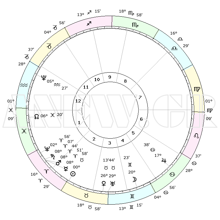 | | ΘΕΣΕΙΣ ΠΛΑΝΗΤΩΝ ΑΣΤΡΟΛΟΓΙΚΟΥ ΧΑΡΤΗ ΤΗΣ ΣΤΙΓΜΗΣ ΑΥΤΗΣ | | | | Πλανήτης | Ζώδιο | Μοίρες | Δεκαήμ. | Σε οίκο | Απόκλιση | | Ακμές των οίκων | | Ηλιος | Ταύρος | 00°54' | Πρώτο | 3 | 11 N 47 | | 1ος | 29°39' | Αιγόκερως | | Σελήνη | Δίδυμοι | 19°26' | Δεύτερο | 5 | 27 N 59 | | 2ος | 13°41' | Ιχθείς | | Ερμής | Κριός | 08°45' | Πρώτο | 2 | 01 N 04 | | 3ος | 22°11' | Κριός | | Αφροδίτη | Ταύρος | 26°08' | Τρίτο | 4 | 19 N 43 | | 4ος | 20°43' | Ταύρος | | Αρης | Κριός | 08°41' | Πρώτο | 2 | 02 N 34 | | 5ος | 13°30' | Δίδυμοι | | Δίας | Καρκίνος | 17°38' | Δεύτερο | 6 | 22 N 39 | | 6ος | 04°55' | Καρκίνος | | Κρόνος | Κριός | 08°06' | Πρώτο | 2 | 01 N 14 | | 7ος | 29°39' | Καρκίνος | | Ουρανός | Ταύρος | 29°44' | Τρίτο | 4 | 19 N 56 | | 8ος | 13°41' | Παρθένος | | Ποσειδώνας | Κριός | 02°56' | Πρώτο | 2 | 00 S 02 | | 9ος | 22°11' | Ζυγός | | Πλούτωνας | Υδροχόος | 05°27' | Πρώτο | 1 | 22 S 48 | | 10ος | 20°43' | Σκορπιός | | Β. Δεσμός | Ιχθείς | 06°21' | Πρώτο | 1 | 09 S 11 | | 11ος | 13°30' | Τοξότης | | Ωροσκόπος | Αιγόκερως | 29°39' | Τρίτο | | | 12ος | 04°55' | Αιγόκερως | | Μεσουράνημα | Σκορπιός | 20°43' | Τρίτο | | | |