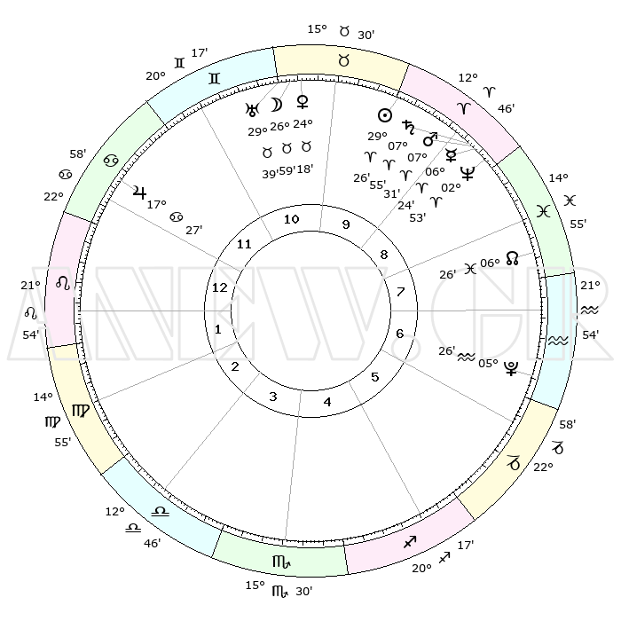 | | ΘΕΣΕΙΣ ΠΛΑΝΗΤΩΝ ΑΣΤΡΟΛΟΓΙΚΟΥ ΧΑΡΤΗ ΤΗΣ ΣΤΙΓΜΗΣ ΑΥΤΗΣ | | | | Πλανήτης | Ζώδιο | Μοίρες | Δεκαήμ. | Σε οίκο | Απόκλιση | | Ακμές των οίκων | | Ηλιος | Κριός | 29°22' | Τρίτο | 10 | 11 N 15 | | 1ος | 03°24' | Λέων | | Σελήνη | Ταύρος | 26°01' | Τρίτο | 10 | 24 N 06 | | 2ος | 24°40' | Λέων | | Ερμής | Κριός | 06°18' | Πρώτο | 9 | 00 N 05 | | 3ος | 20°11' | Παρθένος | | Αφροδίτη | Ταύρος | 24°13' | Τρίτο | 10 | 19 N 11 | | 4ος | 21°37' | Ζυγός | | Αρης | Κριός | 07°28' | Πρώτο | 9 | 02 N 05 | | 5ος | 27°33' | Σκορπιός | | Δίας | Καρκίνος | 17°27' | Δεύτερο | 12 | 22 N 41 | | 6ος | 02°43' | Αιγόκερως | | Κρόνος | Κριός | 07°55' | Πρώτο | 9 | 01 N 10 | | 7ος | 03°24' | Υδροχόος | | Ουρανός | Ταύρος | 29°39' | Τρίτο | 11 | 19 N 54 | | 8ος | 24°40' | Υδροχόος | | Ποσειδώνας | Κριός | 02°53' | Πρώτο | 9 | 00 S 04 | | 9ος | 20°11' | Ιχθείς | | Πλούτωνας | Υδροχόος | 05°26' | Πρώτο | 7 | 22 S 48 | | 10ος | 21°37' | Κριός | | Β. Δεσμός | Ιχθείς | 06°26' | Πρώτο | 8 | 09 S 09 | | 11ος | 27°33' | Ταύρος | | Ωροσκόπος | Λέων | 03°24' | Πρώτο | | | 12ος | 02°43' | Καρκίνος | | Μεσουράνημα | Κριός | 21°37' | Τρίτο | | | |