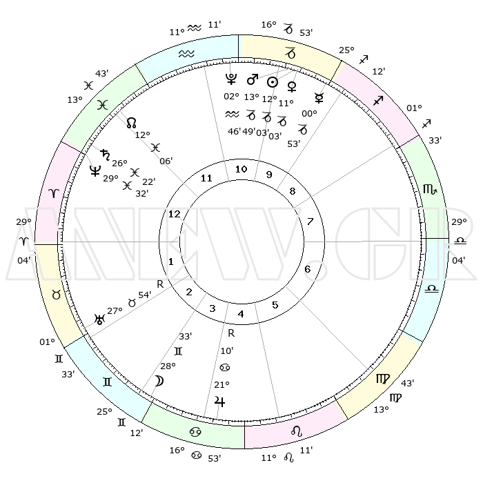 | | ΘΕΣΕΙΣ ΠΛΑΝΗΤΩΝ ΑΣΤΡΟΛΟΓΙΚΟΥ ΧΑΡΤΗ ΤΗΣ ΣΤΙΓΜΗΣ ΑΥΤΗΣ | | | | Πλανήτης | Ζώδιο | Μοίρες | Δεκαήμ. | Σε οίκο | Απόκλιση | | Ακμές των οίκων | | Ηλιος | Αιγόκερως | 11°58' | Δεύτερο | 10 | 22 S 54 | | 1ος | 16°09' | Ιχθείς | | Σελήνη | Δίδυμοι | 27°26' | Τρίτο | 4 | 28 N 16 | | 2ος | 29°25' | Κριός | | Ερμής | Αιγόκερως | 00°46' | Πρώτο | 10 | 24 S 09 | | 3ος | 29°06' | Ταύρος | | Αφροδίτη | Αιγόκερως | 10°57' | Δεύτερο | 10 | 23 S 32 | | 4ος | 22°10' | Δίδυμοι | | Αρης | Αιγόκερως | 13°45' | Δεύτερο | 10 | 23 S 37 | | 5ος | 14°01' | Καρκίνος | | Δίας | Καρκίνος | 21°10'R | Τρίτο | 5 | 22 N 00 | | 6ος | 09°27' | Λέων | | Κρόνος | Ιχθείς | 26°22' | Τρίτο | 1 | 03 S 31 | | 7ος | 16°09' | Παρθένος | | Ουρανός | Ταύρος | 27°54'R | Τρίτο | 2 | 19 N 30 | | 8ος | 29°25' | Ζυγός | | Ποσειδώνας | Ιχθείς | 29°32' | Τρίτο | 1 | 01 S 25 | | 9ος | 29°06' | Σκορπιός | | Πλούτωνας | Υδροχόος | 02°46' | Πρώτο | 11 | 23 S 13 | | 10ος | 22°10' | Τοξότης | | Β. Δεσμός | Ιχθείς | 12°06' | Δεύτερο | 12 | 07 S 01 | | 11ος | 14°01' | Αιγόκερως | | Ωροσκόπος | Ιχθείς | 16°09' | Δεύτερο | | | 12ος | 09°27' | Υδροχόος | | Μεσουράνημα | Τοξότης | 22°10' | Τρίτο | | | |