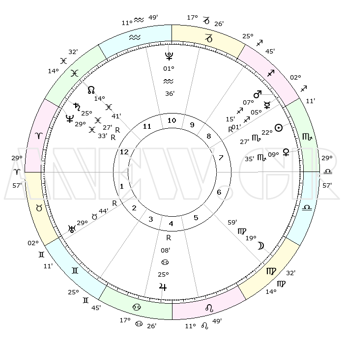 | | ΘΕΣΕΙΣ ΠΛΑΝΗΤΩΝ ΑΣΤΡΟΛΟΓΙΚΟΥ ΧΑΡΤΗ ΤΗΣ ΣΤΙΓΜΗΣ ΑΥΤΗΣ | | | | Πλανήτης | Ζώδιο | Μοίρες | Δεκαήμ. | Σε οίκο | Απόκλιση | | Ακμές των οίκων | | Ηλιος | Σκορπιός | 22°23' | Τρίτο | 8 | 18 S 22 | | 1ος | 18°43' | Ιχθείς | | Σελήνη | Παρθένος | 19°06' | Δεύτερο | 7 | 04 N 04 | | 2ος | 01°30' | Ταύρος | | Ερμής | Τοξότης | 05°04'R | Πρώτο | 9 | 22 S 28 | | 3ος | 00°44' | Δίδυμοι | | Αφροδίτη | Σκορπιός | 09°30' | Πρώτο | 8 | 13 S 30 | | 4ος | 23°38' | Δίδυμοι | | Αρης | Τοξότης | 07°12' | Πρώτο | 9 | 22 S 01 | | 5ος | 15°33' | Καρκίνος | | Δίας | Καρκίνος | 25°08'R | Τρίτο | 5 | 21 N 13 | | 6ος | 11°19' | Λέων | | Κρόνος | Ιχθείς | 25°27'R | Τρίτο | 1 | 04 S 02 | | 7ος | 18°43' | Παρθένος | | Ουρανός | Ταύρος | 29°44'R | Τρίτο | 2 | 19 N 53 | | 8ος | 01°30' | Σκορπιός | | Ποσειδώνας | Ιχθείς | 29°33'R | Τρίτο | 1 | 01 S 26 | | 9ος | 00°44' | Τοξότης | | Πλούτωνας | Υδροχόος | 01°36' | Πρώτο | 11 | 23 S 28 | | 10ος | 23°38' | Τοξότης | | Β. Δεσμός | Ιχθείς | 14°41' | Δεύτερο | 12 | 06 S 02 | | 11ος | 15°33' | Αιγόκερως | | Ωροσκόπος | Ιχθείς | 18°43' | Δεύτερο | | | 12ος | 11°19' | Υδροχόος | | Μεσουράνημα | Τοξότης | 23°38' | Τρίτο | | | |