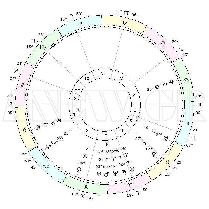 | | ΘΕΣΕΙΣ ΠΛΑΝΗΤΩΝ ΑΣΤΡΟΛΟΓΙΚΟΥ ΧΑΡΤΗ ΤΗΣ ΣΤΙΓΜΗΣ ΑΥΤΗΣ | | | | Πλανήτης | Ζώδιο | Μοίρες | Δεκαήμ. | Σε οίκο | Απόκλιση | | Ακμές των οίκων | | Ηλιος | Κριός | 19°60' | Δεύτερο | 5 | 07 N 49 | | 1ος | 03°07' | Τοξότης | | Σελήνη | Αιγόκερως | 16°06' | Δεύτερο | 2 | 26 S 31 | | 2ος | 04°42' | Αιγόκερως | | Ερμής | Ιχθείς | 23°01' | Τρίτο | 4 | 04 S 54 | | 3ος | 10°55' | Υδροχόος | | Αφροδίτη | Ταύρος | 12°31' | Δεύτερο | 6 | 15 N 32 | | 4ος | 17°01' | Ιχθείς | | Αρης | Κριός | 00°02'R | Πρώτο | 4 | 00 S 55 | | 5ος | 17°39' | Κριός | | Δίας | Καρκίνος | 16°28' | Δεύτερο | 8 | 22 N 48 | | 6ος | 12°16' | Ταύρος | | Κρόνος | Κριός | 06°45' | Πρώτο | 4 | 00 N 43 | | 7ος | 03°07' | Δίδυμοι | | Ουρανός | Ταύρος | 29°10' | Τρίτο | 6 | 19 N 48 | | 8ος | 04°42' | Καρκίνος | | Ποσειδώνας | Κριός | 02°32' | Πρώτο | 4 | 00 S 12 | | 9ος | 10°55' | Λέων | | Πλούτωνας | Υδροχόος | 05°21' | Πρώτο | 2 | 22 S 47 | | 10ος | 17°01' | Παρθένος | | Β. Δεσμός | Ιχθείς | 06°56' | Πρώτο | 3 | 08 S 58 | | 11ος | 17°39' | Ζυγός | | Ωροσκόπος | Τοξότης | 03°07' | Πρώτο | | | 12ος | 12°16' | Σκορπιός | | Μεσουράνημα | Παρθένος | 17°01' | Δεύτερο | | | |