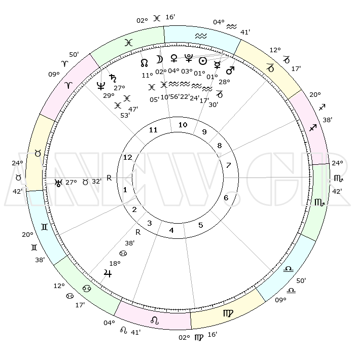 | | ΘΕΣΕΙΣ ΠΛΑΝΗΤΩΝ ΑΣΤΡΟΛΟΓΙΚΟΥ ΧΑΡΤΗ ΤΗΣ ΣΤΙΓΜΗΣ ΑΥΤΗΣ | | | | Πλανήτης | Ζώδιο | Μοίρες | Δεκαήμ. | Σε οίκο | Απόκλιση | | Ακμές των οίκων | | Ηλιος | Υδροχόος | 01°20' | Πρώτο | 10 | 19 S 51 | | 1ος | 15°20' | Κριός | | Σελήνη | Ιχθείς | 01°11' | Πρώτο | 11 | 11 S 45 | | 2ος | 21°38' | Ταύρος | | Ερμής | Υδροχόος | 01°09' | Πρώτο | 10 | 21 S 54 | | 3ος | 16°53' | Δίδυμοι | | Αφροδίτη | Υδροχόος | 04°51' | Πρώτο | 11 | 20 S 10 | | 4ος | 08°41' | Καρκίνος | | Αρης | Αιγόκερως | 28°27' | Τρίτο | 10 | 21 S 27 | | 5ος | 01°51' | Λέων | | Δίας | Καρκίνος | 18°38'R | Δεύτερο | 4 | 22 N 25 | | 6ος | 01°48' | Παρθένος | | Κρόνος | Ιχθείς | 27°46' | Τρίτο | 12 | 02 S 54 | | 7ος | 15°20' | Ζυγός | | Ουρανός | Ταύρος | 27°32'R | Τρίτο | 2 | 19 N 25 | | 8ος | 21°38' | Σκορπιός | | Ποσειδώνας | Ιχθείς | 29°52' | Τρίτο | 12 | 01 S 16 | | 9ος | 16°53' | Τοξότης | | Πλούτωνας | Υδροχόος | 03°22' | Πρώτο | 11 | 23 S 05 | | 10ος | 08°41' | Αιγόκερως | | Β. Δεσμός | Ιχθείς | 11°05' | Δεύτερο | 12 | 07 S 24 | | 11ος | 01°51' | Υδροχόος | | Ωροσκόπος | Κριός | 15°20' | Δεύτερο | | | 12ος | 01°48' | Ιχθείς | | Μεσουράνημα | Αιγόκερως | 08°41' | Πρώτο | | | |