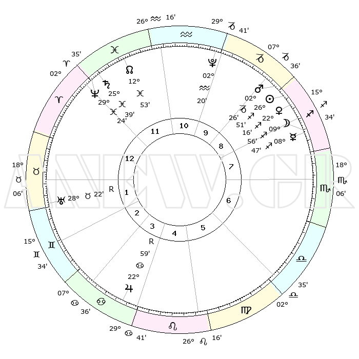 | | ΘΕΣΕΙΣ ΠΛΑΝΗΤΩΝ ΑΣΤΡΟΛΟΓΙΚΟΥ ΧΑΡΤΗ ΤΗΣ ΣΤΙΓΜΗΣ ΑΥΤΗΣ | | | | Πλανήτης | Ζώδιο | Μοίρες | Δεκαήμ. | Σε οίκο | Απόκλιση | | Ακμές των οίκων | | Ηλιος | Τοξότης | 26°27' | Τρίτο | 1 | 23 S 23 | | 1ος | 28°47' | Σκορπιός | | Σελήνη | Τοξότης | 05°21' | Πρώτο | 1 | 26 S 04 | | 2ος | 29°45' | Τοξότης | | Ερμής | Τοξότης | 08°14' | Πρώτο | 1 | 20 S 33 | | 3ος | 05°15' | Υδροχόος | | Αφροδίτη | Τοξότης | 21°47' | Τρίτο | 1 | 23 S 08 | | 4ος | 11°16' | Ιχθείς | | Αρης | Αιγόκερως | 02°09' | Πρώτο | 2 | 24 S 13 | | 5ος | 12°27' | Κριός | | Δίας | Καρκίνος | 23°02'R | Τρίτο | 8 | 21 N 40 | | 6ος | 07°40' | Ταύρος | | Κρόνος | Ιχθείς | 25°38' | Τρίτο | 4 | 03 S 51 | | 7ος | 28°47' | Ταύρος | | Ουρανός | Ταύρος | 28°23'R | Τρίτο | 6 | 19 N 36 | | 8ος | 29°45' | Δίδυμοι | | Ποσειδώνας | Ιχθείς | 29°23' | Τρίτο | 4 | 01 S 28 | | 9ος | 05°15' | Λέων | | Πλούτωνας | Υδροχόος | 02°19' | Πρώτο | 2 | 23 S 18 | | 10ος | 11°16' | Παρθένος | | Β. Δεσμός | Ιχθείς | 12°54' | Δεύτερο | 4 | 06 S 43 | | 11ος | 12°27' | Ζυγός | | Ωροσκόπος | Σκορπιός | 28°47' | Τρίτο | | | 12ος | 07°40' | Σκορπιός | | Μεσουράνημα | Παρθένος | 11°16' | Δεύτερο | | | |