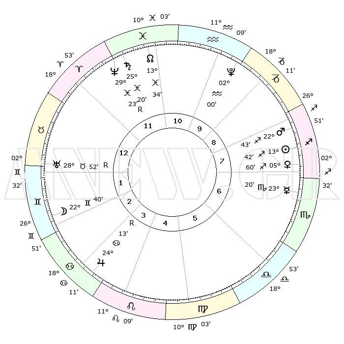 | | ΘΕΣΕΙΣ ΠΛΑΝΗΤΩΝ ΑΣΤΡΟΛΟΓΙΚΟΥ ΧΑΡΤΗ ΤΗΣ ΣΤΙΓΜΗΣ ΑΥΤΗΣ | | | | Πλανήτης | Ζώδιο | Μοίρες | Δεκαήμ. | Σε οίκο | Απόκλιση | | Ακμές των οίκων | | Ηλιος | Τοξότης | 13°40' | Δεύτερο | 7 | 22 S 26 | | 1ος | 17°44' | Ταύρος | | Σελήνη | Δίδυμοι | 22°09' | Τρίτο | 2 | 28 N 08 | | 2ος | 15°18' | Δίδυμοι | | Ερμής | Σκορπιός | 23°18' | Τρίτο | 7 | 16 S 10 | | 3ος | 07°21' | Καρκίνος | | Αφροδίτη | Τοξότης | 05°57' | Πρώτο | 7 | 20 S 46 | | 4ος | 29°25' | Καρκίνος | | Αρης | Τοξότης | 22°42' | Τρίτο | 8 | 23 S 56 | | 5ος | 25°56' | Λέων | | Δίας | Καρκίνος | 24°13'R | Τρίτο | 3 | 21 N 26 | | 6ος | 02°12' | Ζυγός | | Κρόνος | Ιχθείς | 25°20' | Τρίτο | 11 | 04 S 01 | | 7ος | 17°44' | Σκορπιός | | Ουρανός | Ταύρος | 28°52'R | Τρίτο | 1 | 19 N 42 | | 8ος | 15°18' | Τοξότης | | Ποσειδώνας | Ιχθείς | 29°23'R | Τρίτο | 11 | 01 S 29 | | 9ος | 07°21' | Αιγόκερως | | Πλούτωνας | Υδροχόος | 02°00' | Πρώτο | 10 | 23 S 23 | | 10ος | 29°25' | Αιγόκερως | | Β. Δεσμός | Ιχθείς | 13°34' | Δεύτερο | 11 | 06 S 28 | | 11ος | 25°56' | Υδροχόος | | Ωροσκόπος | Ταύρος | 17°44' | Δεύτερο | | | 12ος | 02°12' | Κριός | | Μεσουράνημα | Αιγόκερως | 29°25' | Τρίτο | | | |