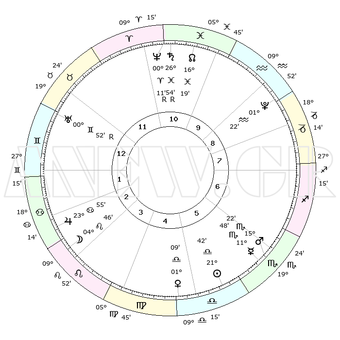 | ΘΕΣΕΙΣ ΠΛΑΝΗΤΩΝ ΑΣΤΡΟΛΟΓΙΚΟΥ ΧΑΡΤΗ ΤΗΣ ΣΤΙΓΜΗΣ ΑΥΤΗΣ | | Πλανήτης | Ζώδιο | Μοίρες | Δεκαήμ. | Σε οίκο | Απόκλιση | | Ακμές των οίκων | Ηλιος | Ζυγός | 21°32' | Τρίτο | 7 | 08 S 24 | | 1ος | 12°50' | Κριός | Σελήνη | Λέων | 02°34' | Πρώτο | 5 | 23 N 12 | | 2ος | 19°48' | Ταύρος | Ερμής | Σκορπιός | 11°34' | Δεύτερο | 7 | 16 S 55 | | 3ος | 15°23' | Δίδυμοι | Αφροδίτη | Ζυγός | 00°57' | Πρώτο | 6 | 01 N 00 | | 4ος | 07°15' | Καρκίνος | Αρης | Σκορπιός | 15°15' | Δεύτερο | 7 | 16 S 37 | | 5ος | 00°15' | Λέων | Δίας | Καρκίνος | 23°54' | Τρίτο | 4 | 21 N 22 | | 6ος | 29°45' | Λέων | Κρόνος | Ιχθείς | 26°55'R | Τρίτο | 12 | 03 S 31 | | 7ος | 12°50' | Ζυγός | Ουρανός | Δίδυμοι | 00°52'R | Πρώτο | 2 | 20 N 07 | | 8ος | 19°48' | Σκορπιός | Ποσειδώνας | Κριός | 00°11'R | Πρώτο | 12 | 01 S 11 | | 9ος | 15°23' | Τοξότης | Πλούτωνας | Υδροχόος | 01°22' | Πρώτο | 11 | 23 S 32 | | 10ος | 07°15' | Αιγόκερως | Β. Δεσμός | Ιχθείς | 16°19' | Δεύτερο | 12 | 05 S 24 | | 11ος | 00°15' | Υδροχόος | Ωροσκόπος | Κριός | 12°50' | Δεύτερο | | | 12ος | 29°45' | Υδροχόος | Μεσουράνημα | Αιγόκερως | 07°15' | Πρώτο | | | |
