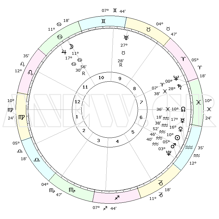 | | ΘΕΣΕΙΣ ΠΛΑΝΗΤΩΝ ΑΣΤΡΟΛΟΓΙΚΟΥ ΧΑΡΤΗ ΤΗΣ ΣΤΙΓΜΗΣ ΑΥΤΗΣ | | | | Πλανήτης | Ζώδιο | Μοίρες | Δεκαήμ. | Σε οίκο | Απόκλιση | | Ακμές των οίκων | | Ηλιος | Υδροχόος | 10°48' | Δεύτερο | 6 | 17 S 31 | | 1ος | 22°23' | Λέων | | Σελήνη | Καρκίνος | 11°02' | Δεύτερο | 11 | 27 N 23 | | 2ος | 15°26' | Παρθένος | | Ερμής | Υδροχόος | 17°11' | Δεύτερο | 6 | 17 S 32 | | 3ος | 13°21' | Ζυγός | | Αφροδίτη | Υδροχόος | 16°33' | Δεύτερο | 6 | 17 S 09 | | 4ος | 16°06' | Σκορπιός | | Αρης | Υδροχόος | 05°43' | Πρώτο | 6 | 19 S 51 | | 5ος | 20°50' | Τοξότης | | Δίας | Καρκίνος | 17°30'R | Δεύτερο | 11 | 22 N 35 | | 6ος | 23°29' | Αιγόκερως | | Κρόνος | Ιχθείς | 28°38' | Τρίτο | 8 | 02 S 33 | | 7ος | 22°23' | Υδροχόος | | Ουρανός | Ταύρος | 27°28'R | Τρίτο | 10 | 19 N 24 | | 8ος | 15°26' | Ιχθείς | | Ποσειδώνας | Κριός | 00°06' | Πρώτο | 8 | 01 S 10 | | 9ος | 13°21' | Κριός | | Πλούτωνας | Υδροχόος | 03°40' | Πρώτο | 6 | 23 S 02 | | 10ος | 16°06' | Ταύρος | | Β. Δεσμός | Ιχθείς | 10°36' | Δεύτερο | 7 | 07 S 36 | | 11ος | 20°50' | Δίδυμοι | | Ωροσκόπος | Λέων | 22°23' | Τρίτο | | | 12ος | 23°29' | Καρκίνος | | Μεσουράνημα | Ταύρος | 16°06' | Δεύτερο | | | |