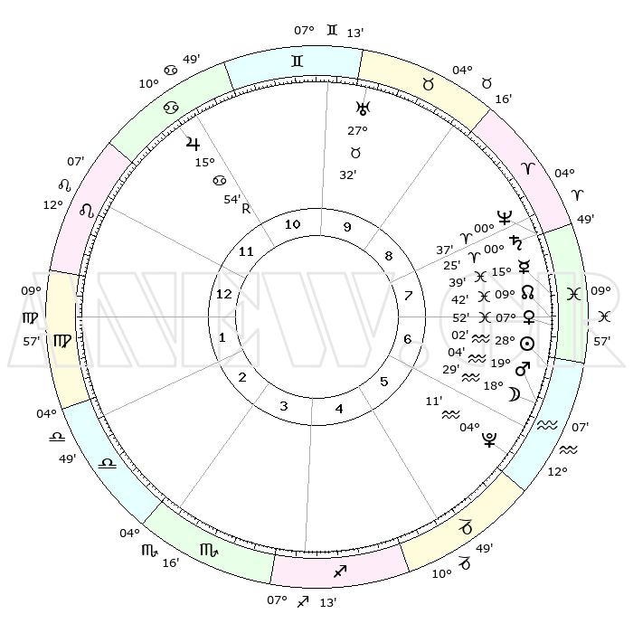 | | ΘΕΣΕΙΣ ΠΛΑΝΗΤΩΝ ΑΣΤΡΟΛΟΓΙΚΟΥ ΧΑΡΤΗ ΤΗΣ ΣΤΙΓΜΗΣ ΑΥΤΗΣ | | | | Πλανήτης | Ζώδιο | Μοίρες | Δεκαήμ. | Σε οίκο | Απόκλιση | | Ακμές των οίκων | | Ηλιος | Υδροχόος | 27°58' | Τρίτο | 7 | 12 S 11 | | 1ος | 21°09' | Λέων | | Σελήνη | Υδροχόος | 17°39' | Δεύτερο | 6 | 17 S 22 | | 2ος | 14°04' | Παρθένος | | Ερμής | Ιχθείς | 15°34' | Δεύτερο | 8 | 05 S 18 | | 3ος | 11°51' | Ζυγός | | Αφροδίτη | Ιχθείς | 07°47' | Πρώτο | 7 | 10 S 00 | | 4ος | 14°33' | Σκορπιός | | Αρης | Υδροχόος | 19°01' | Δεύτερο | 6 | 16 S 09 | | 5ος | 19°23' | Τοξότης | | Δίας | Καρκίνος | 15°54'R | Δεύτερο | 11 | 22 N 49 | | 6ος | 22°09' | Αιγόκερως | | Κρόνος | Κριός | 00°24' | Πρώτο | 8 | 01 S 48 | | 7ος | 21°09' | Υδροχόος | | Ουρανός | Ταύρος | 27°32' | Τρίτο | 10 | 19 N 25 | | 8ος | 14°04' | Ιχθείς | | Ποσειδώνας | Κριός | 00°37' | Πρώτο | 8 | 00 S 57 | | 9ος | 11°51' | Κριός | | Πλούτωνας | Υδροχόος | 04°11' | Πρώτο | 6 | 22 S 56 | | 10ος | 14°33' | Ταύρος | | Β. Δεσμός | Ιχθείς | 09°42' | Πρώτο | 7 | 07 S 56 | | 11ος | 19°23' | Δίδυμοι | | Ωροσκόπος | Λέων | 21°09' | Τρίτο | | | 12ος | 22°09' | Καρκίνος | | Μεσουράνημα | Ταύρος | 14°33' | Δεύτερο | | | |
