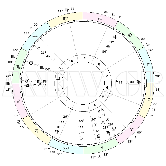 |  | ΘΕΣΕΙΣ ΠΛΑΝΗΤΩΝ ΑΣΤΡΟΛΟΓΙΚΟΥ ΧΑΡΤΗ ΤΗΣ ΣΤΙΓΜΗΣ ΑΥΤΗΣ |  |  |  | | Πλανήτης | Ζώδιο | Μοίρες | Δεκαήμ. | Σε οίκο | Απόκλιση |  | Ακμές των οίκων |  | Ηλιος | Σκορπιός | 07°52' | Πρώτο | 2 | 14 S 08 |  | 1ος | 20°51' | Παρθένος |  | Σελήνη | Υδροχόος | 24°03' | Τρίτο | 6 | 15 S 24 |  | 2ος | 16°43' | Ζυγός |  | Ερμής | Τοξότης | 01°33' | Πρώτο | 3 | 23 S 18 |  | 3ος | 16°47' | Σκορπιός |  | Αφροδίτη | Ζυγός | 21°23' | Τρίτο | 2 | 06 S 58 |  | 4ος | 19°42' | Τοξότης |  | Αρης | Σκορπιός | 26°48' | Τρίτο | 3 | 19 S 49 |  | 5ος | 22°52' | Αιγόκερως |  | Δίας | Καρκίνος | 24°56' | Τρίτο | 11 | 21 N 13 |  | 6ος | 23°39' | Υδροχόος |  | Κρόνος | Ιχθείς | 25°58'R | Τρίτο | 7 | 03 S 52 |  | 7ος | 20°51' | Ιχθείς |  | Ουρανός | Δίδυμοι | 00°19'R | Πρώτο | 9 | 20 N 00 |  | 8ος | 16°44' | Κριός |  | Ποσειδώνας | Ιχθείς | 29°48'R | Τρίτο | 7 | 01 S 20 |  | 9ος | 16°47' | Ταύρος |  | Πλούτωνας | Υδροχόος | 01°26' | Πρώτο | 5 | 23 S 31 |  | 10ος | 19°42' | Δίδυμοι |  | Β. Δεσμός | Ιχθείς | 15°27' | Δεύτερο | 6 | 05 S 44 |  | 11ος | 22°52' | Καρκίνος |  | Ωροσκόπος | Παρθένος | 20°51' | Τρίτο |  |  | 12ος | 23°39' | Λέων |  | Μεσουράνημα | Δίδυμοι | 19°42' | Δεύτερο |  |  |  |