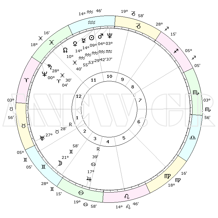 | | ΘΕΣΕΙΣ ΠΛΑΝΗΤΩΝ ΑΣΤΡΟΛΟΓΙΚΟΥ ΧΑΡΤΗ ΤΗΣ ΣΤΙΓΜΗΣ ΑΥΤΗΣ | | | | Πλανήτης | Ζώδιο | Μοίρες | Δεκαήμ. | Σε οίκο | Απόκλιση | | Ακμές των οίκων | | Ηλιος | Υδροχόος | 09°24' | Πρώτο | 11 | 17 S 54 | | 1ος | 25°58' | Ιχθείς | | Σελήνη | Δίδυμοι | 20°60' | Τρίτο | 3 | 28 N 13 | | 2ος | 07°13' | Ταύρος | | Ερμής | Υδροχόος | 14°46' | Δεύτερο | 11 | 18 S 19 | | 3ος | 05°15' | Δίδυμοι | | Αφροδίτη | Υδροχόος | 14°49' | Δεύτερο | 11 | 17 S 39 | | 4ος | 27°44' | Δίδυμοι | | Αρης | Υδροχόος | 04°38' | Πρώτο | 11 | 20 S 06 | | 5ος | 19°53' | Καρκίνος | | Δίας | Καρκίνος | 17°40'R | Δεύτερο | 4 | 22 N 34 | | 6ος | 16°41' | Λέων | | Κρόνος | Ιχθείς | 28°30' | Τρίτο | 1 | 02 S 36 | | 7ος | 25°58' | Παρθένος | | Ουρανός | Ταύρος | 27°28'R | Τρίτο | 2 | 19 N 24 | | 8ος | 07°13' | Σκορπιός | | Ποσειδώνας | Κριός | 00°04' | Πρώτο | 1 | 01 S 11 | | 9ος | 05°15' | Τοξότης | | Πλούτωνας | Υδροχόος | 03°37' | Πρώτο | 11 | 23 S 02 | | 10ος | 27°44' | Τοξότης | | Β. Δεσμός | Ιχθείς | 10°40' | Δεύτερο | 12 | 07 S 34 | | 11ος | 19°53' | Αιγόκερως | | Ωροσκόπος | Ιχθείς | 25°58' | Τρίτο | | | 12ος | 16°41' | Υδροχόος | | Μεσουράνημα | Τοξότης | 27°44' | Τρίτο | | | |
